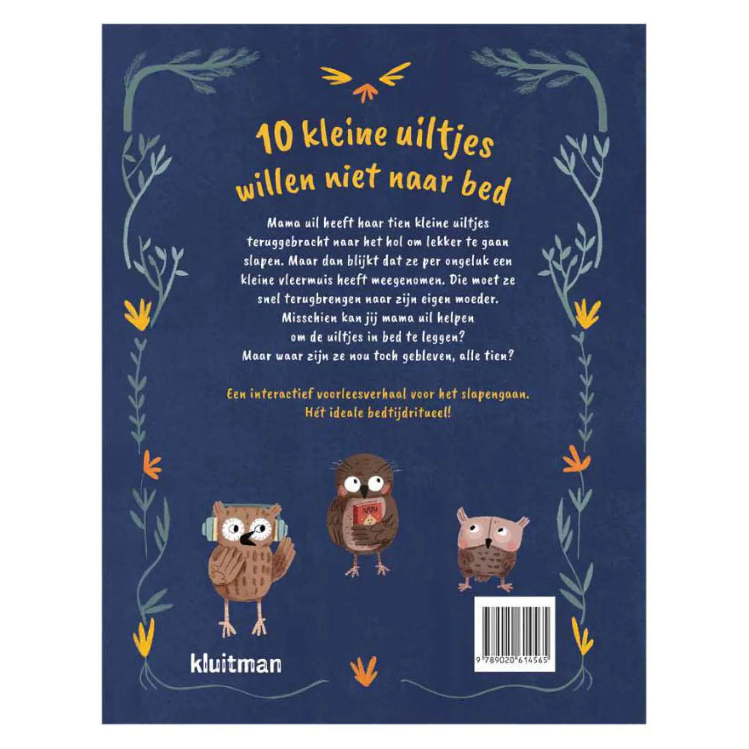 Mama uil heeft haar tien kleine uiltjes teruggebracht naar het hol om lekker te gaan slapen. Maar dan blijkt dat ze per ongeluk een kleine vleermuis heeft meegenomen. Die moet ze snel terugbrengen naar zijn eigen moeder. Misschien kan jij mama uil helpen om de uiltjes in bed te leggen? Maar waar zijn ze nou toch gebleven, alle tien?