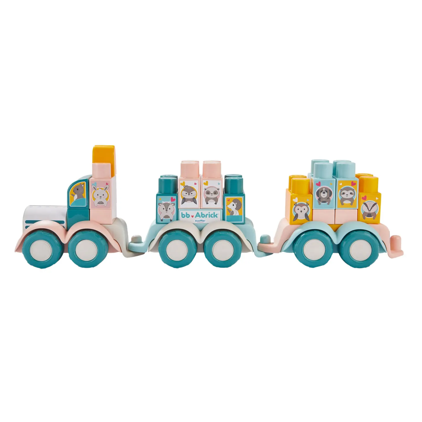 AAN BOORD VAN DE TREIN: dit pakket bevat 3 verwisselbare rollende chassis voor de locomotief en zijn wagons, evenals 30 bouwblokken. In totaal 51 onderdelen.