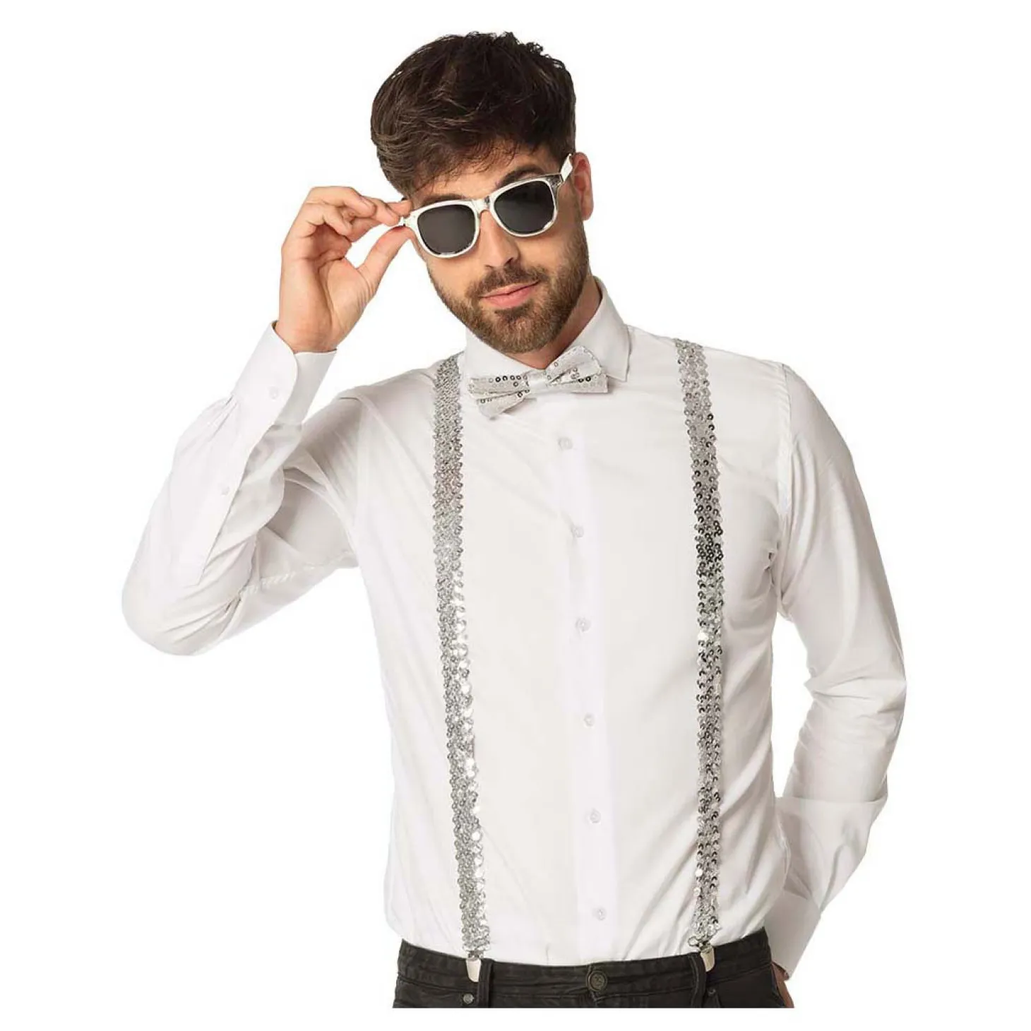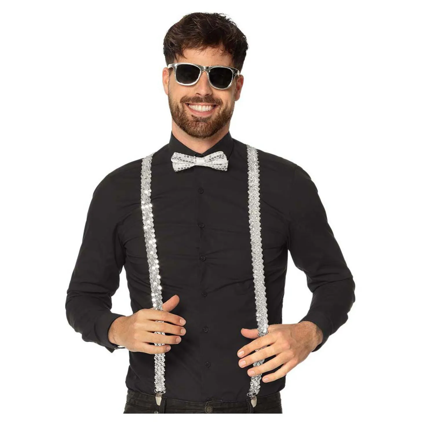 • Zilveren accessoireset met partybril, vlinderstrik en bretels