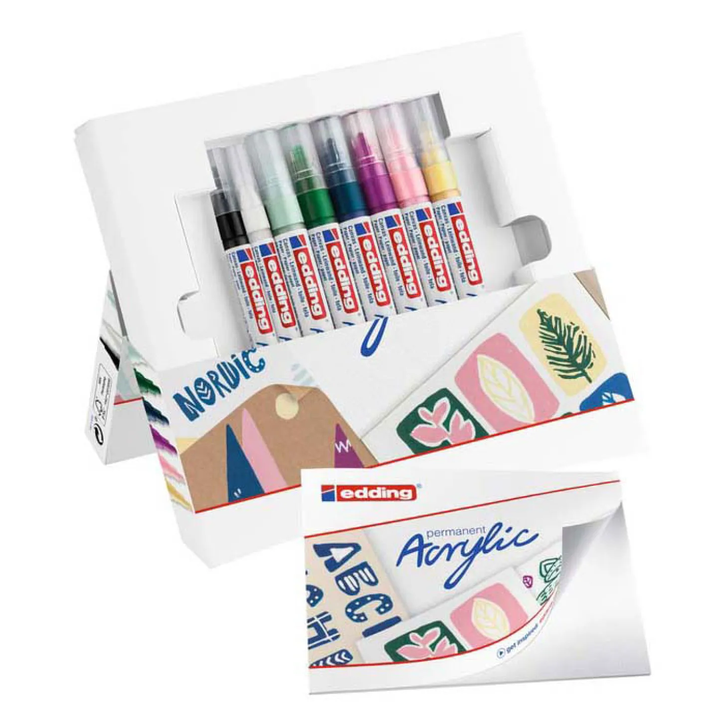 •De set bevat 2 edding 5300 acrylmarkers fijn en 6 edding 5100 acrylmarkers middelfijn. edding 5300 acrylmarker fijn: 1x zwart, verkeerswit. edding 5100 acrylmarker middelfijn: 1x zacht mint, elegant nachtblauw, stijlvol mauve, pastelgeel, bessenrood en mosgroen.
