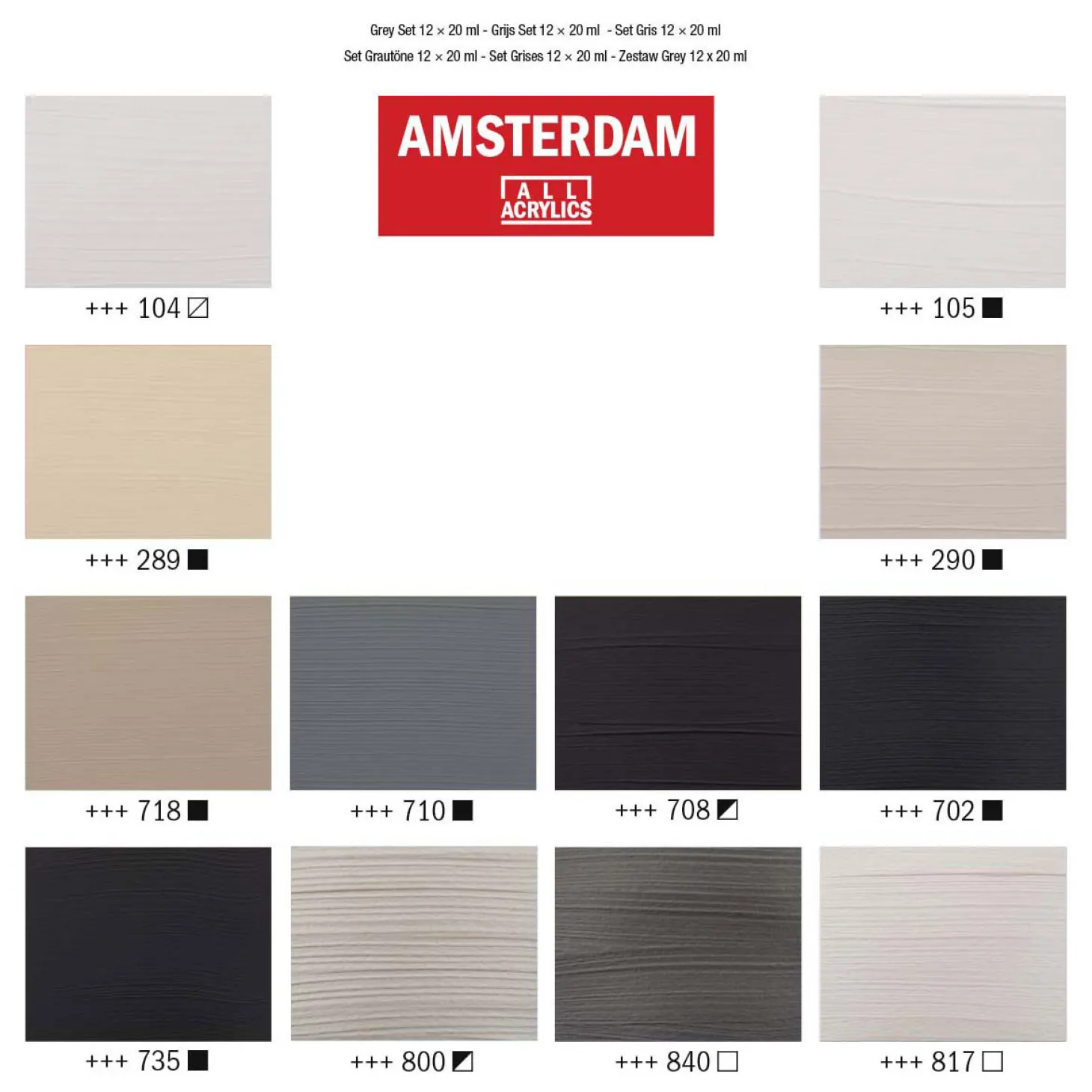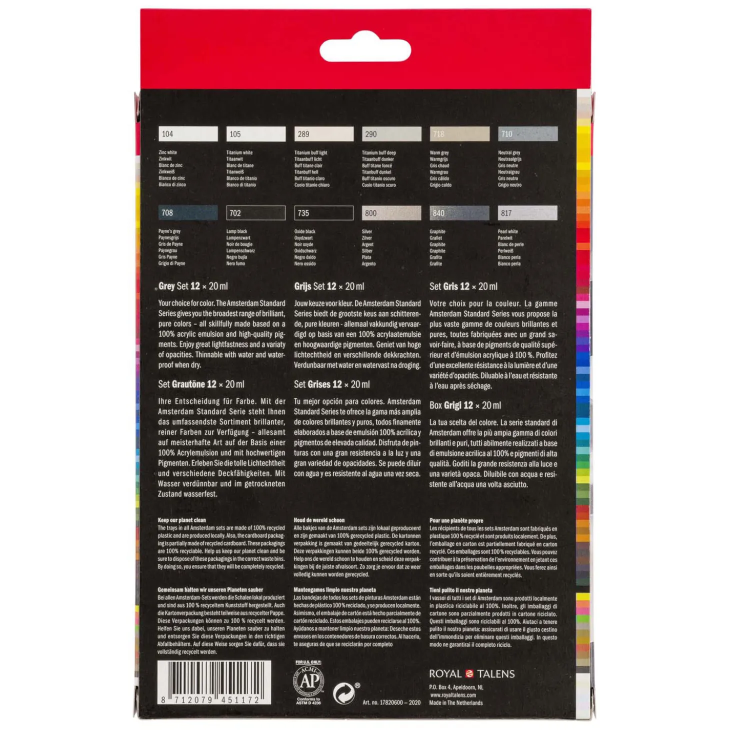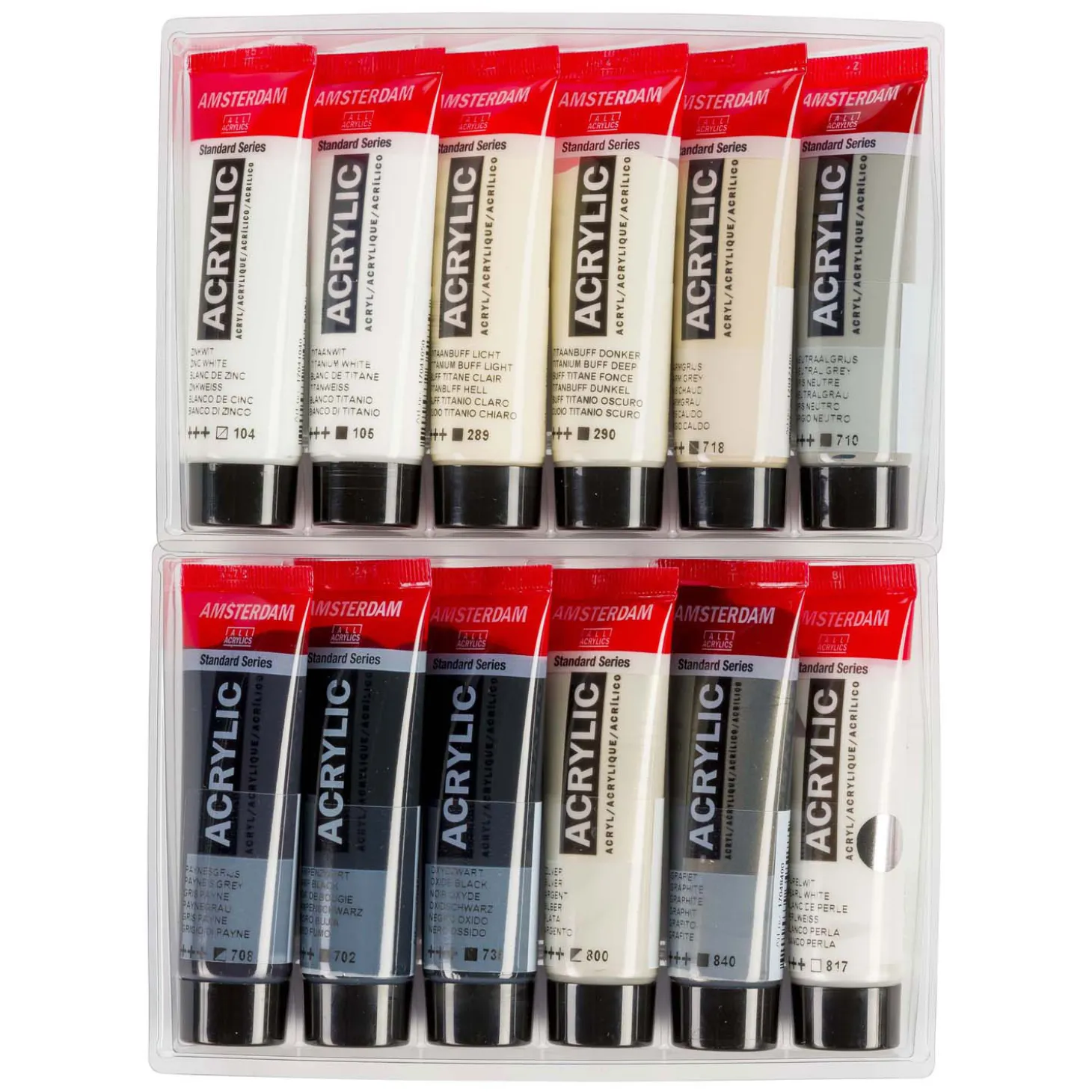 Inhoud: 12 x 20 ml tubes (104 Zinkwit – 105 Titaanwit – 289 Titaanbuff Licht – 290 Titaanbuff Donker – 718 Warmgrijs – 710 Neutraalgrijs – 708 Paynesgrijs – 702 Lampenzwart – 735 Oxydzwart – 800 Zilver – 840 Grafiet – 817 Parelwit).