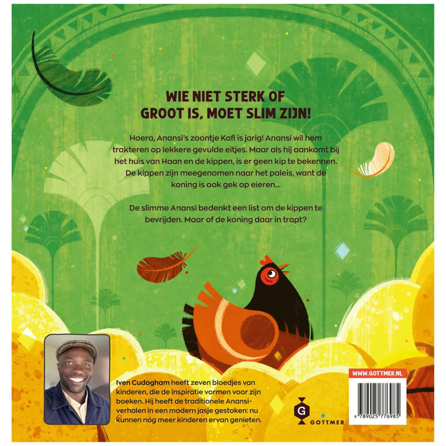 Voor de verjaardag van zijn zoontje Kofi wil Anansi hem trakteren op de lekkerste gevulde eieren. Maar als hij ’s ochtends vroeg aankomt bij het huis van Haan en de kippen, treft hij alleen maar een huilende Haan aan – de kippen zijn weg! De koning en zijn wachters hebben ze allemaal meegenomen, want de koning vindt de eieren zo lekker dat hij ze allemaal voor zichzelf wil houden. Maar niemand bedenkt een list zoals Anansi dat kan, en dit laat onze achtpotige slimmerik natuurlijk niet zomaar gebeuren!