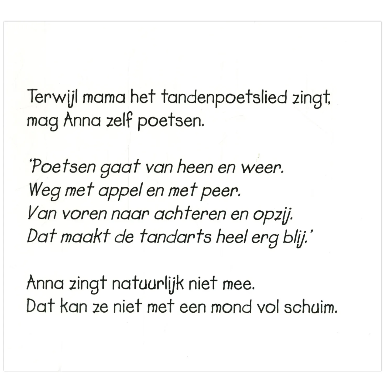 Anna is moe. Ze gaat naar bed. Maar eerst moet ze haar tanden nog poetsen. Anna pakt haar tandenborstel en mama doet er speciale peutertandpasta op. Dan kan het poetsen beginnen… Een vrolijk verhaal met een aanstekelijk liedje dat tanden poetsen leuk maakt, voor peuters vanaf 24 maanden.
