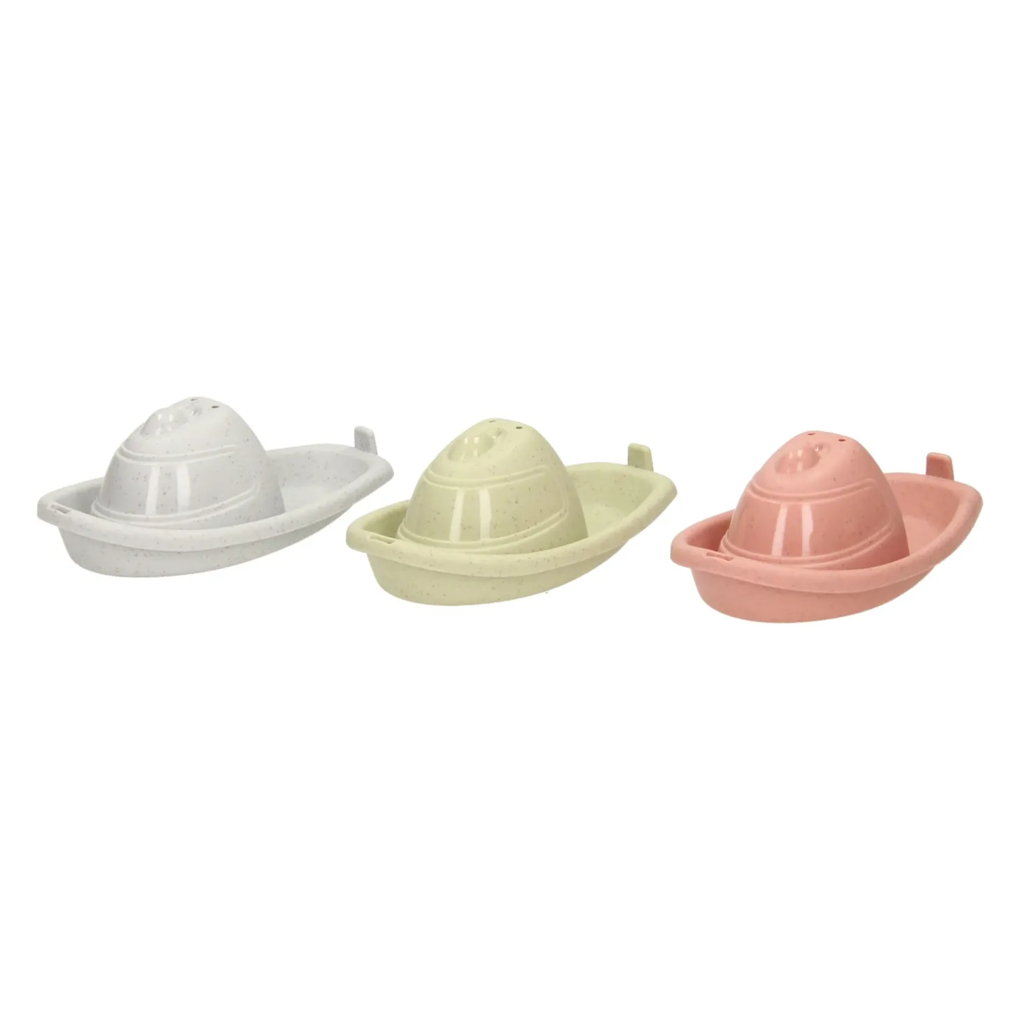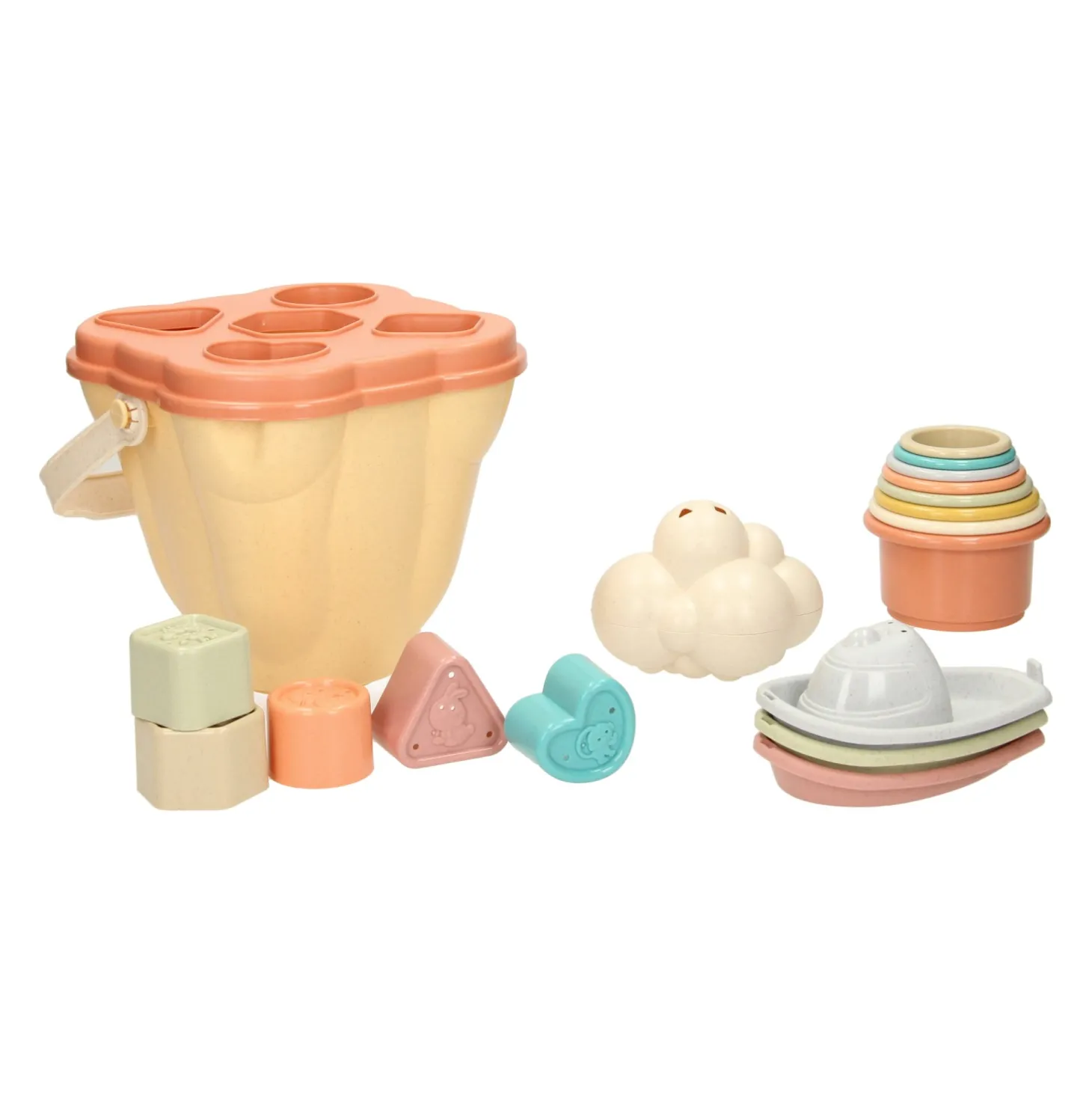 Baby Badset in vormenbox. De set bestaat uit een vormenstoof met blokken, drie badbootjes, en stapelbekers die voorzien zijn van gaatjes waar het doorheen kan stromen. Voor uren waterplezier!