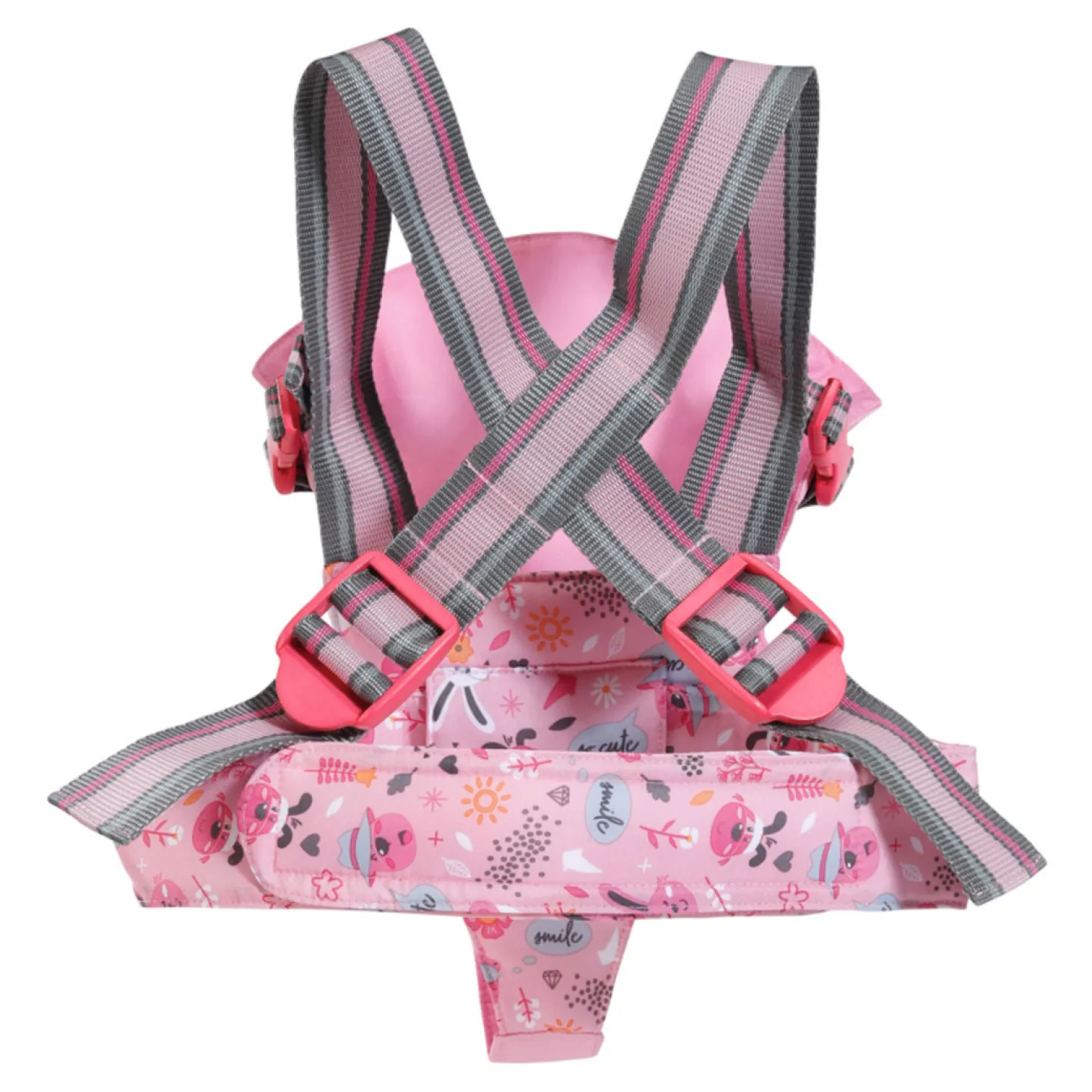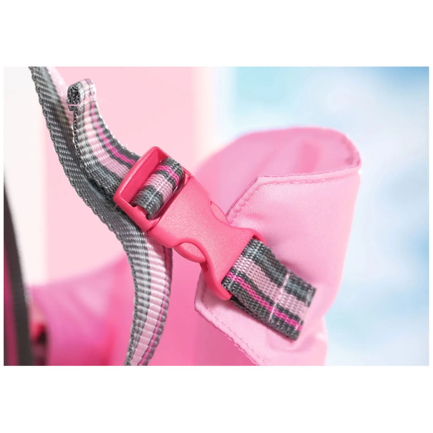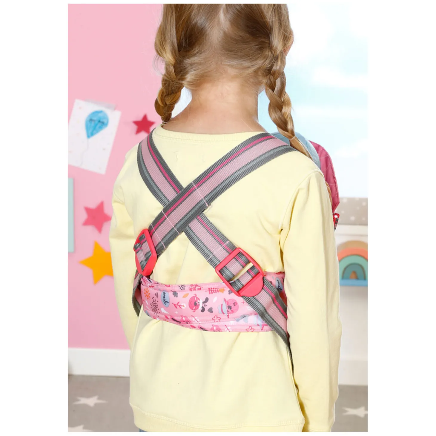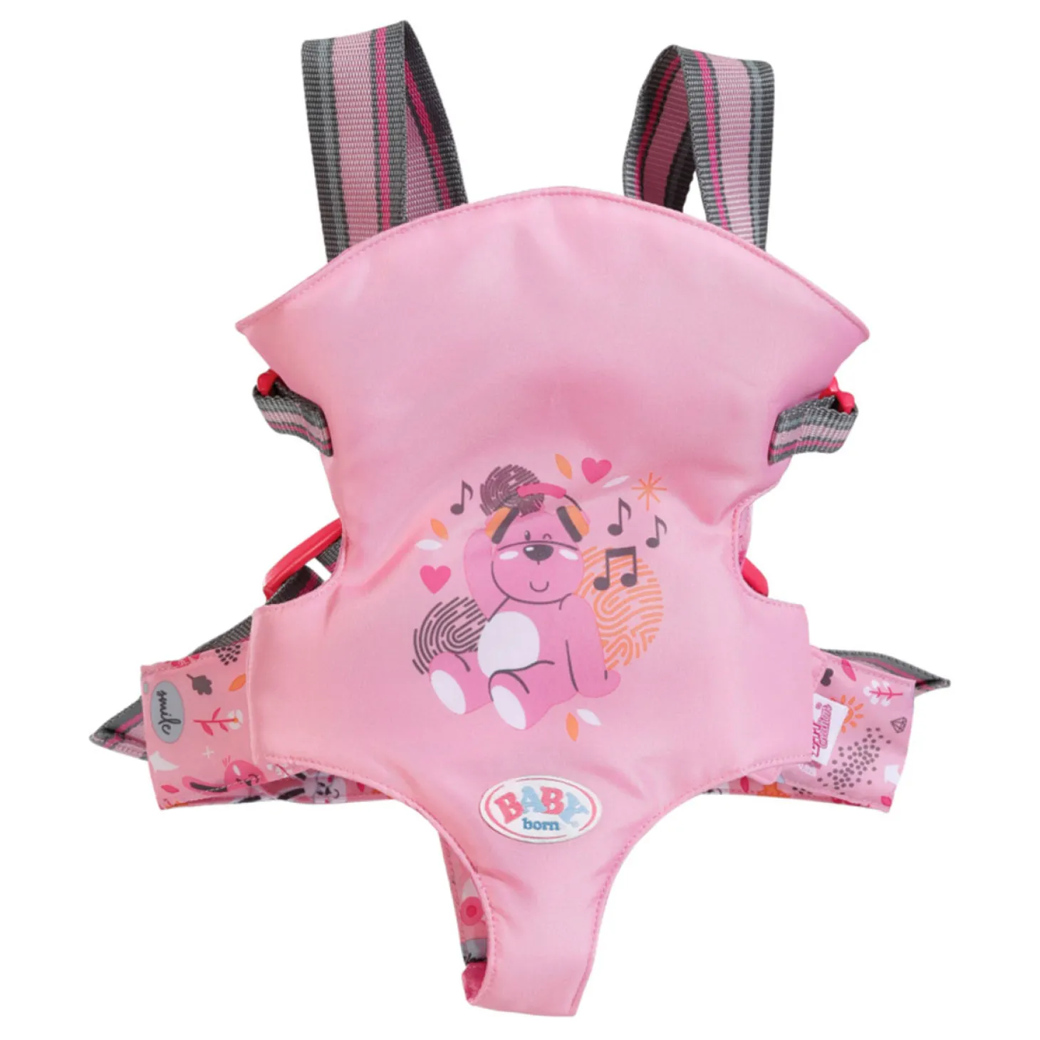 De binnenkant en de heupband van de draagzak zijn versierd met schattige grafische afbeeldingen. Op de roze buitenstof prijkt Bruno de beer. Hij lijkt net zo ontspannen als BABY born in het zitje. Dankzij de verstelbare draagbanden kunnen mama en papa het kleintje om de beurt dragen.
