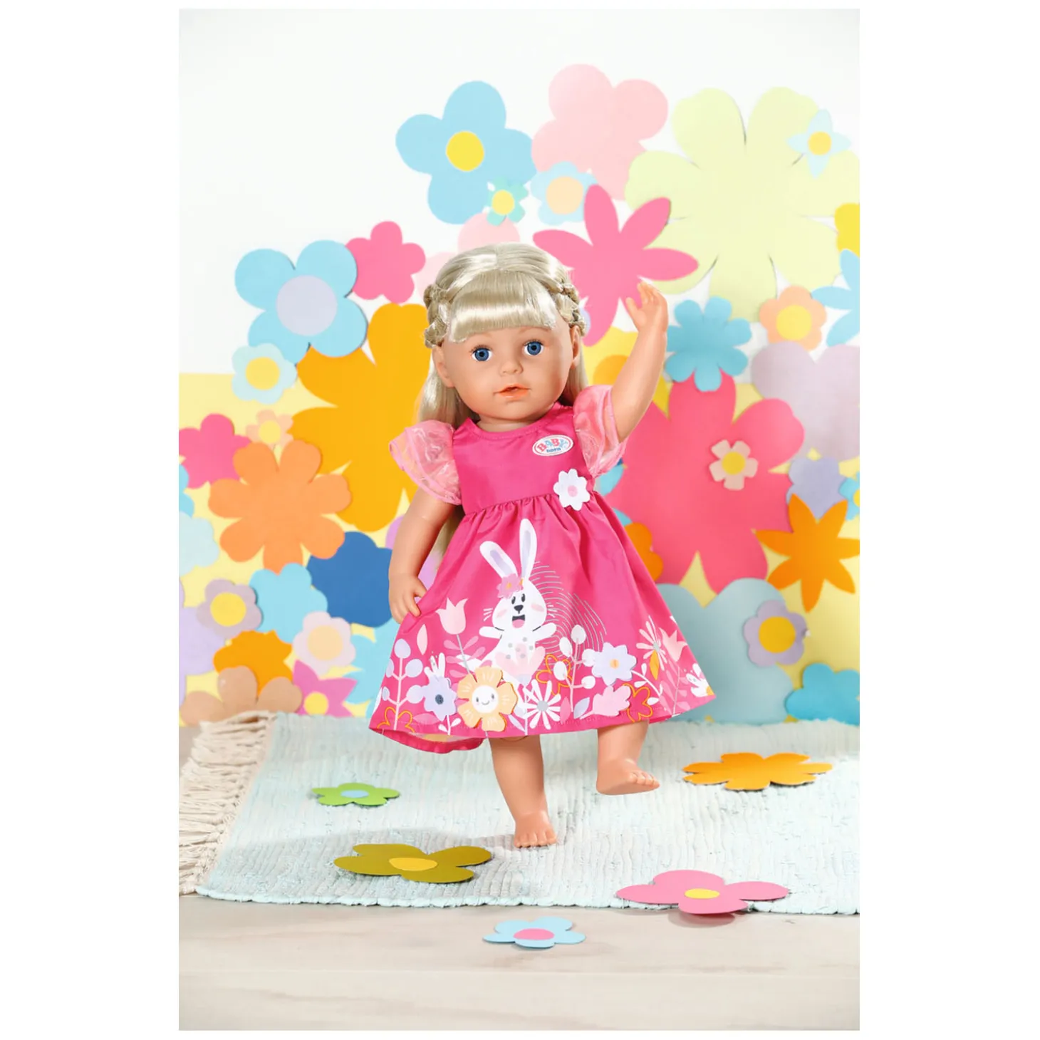Net als BABY born huppelt Bine het konijn door de weide op de roze jurk. Sommige bloemen, plus de bloem op de naad tussen top en rok, zijn 3D-applicaties. De schattige mouwen zijn van roze tule en doen denken aan tere bloemblaadjes.