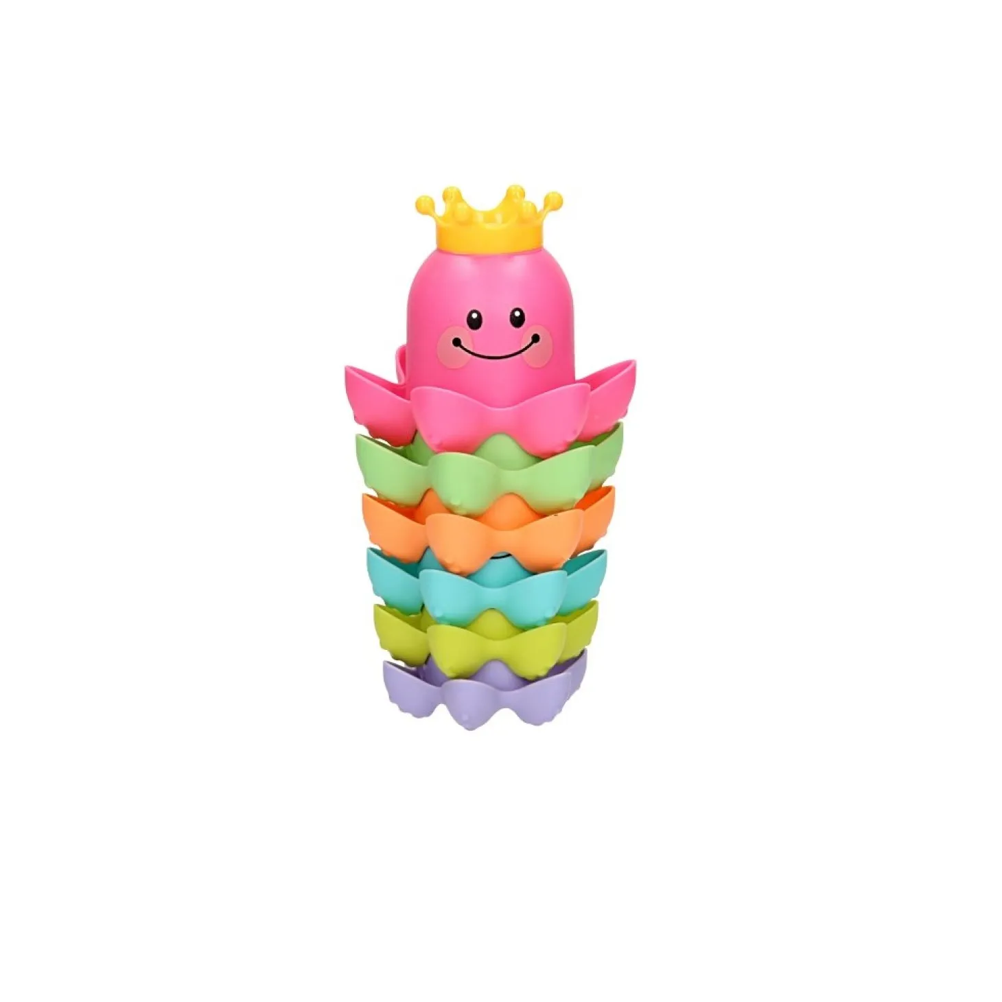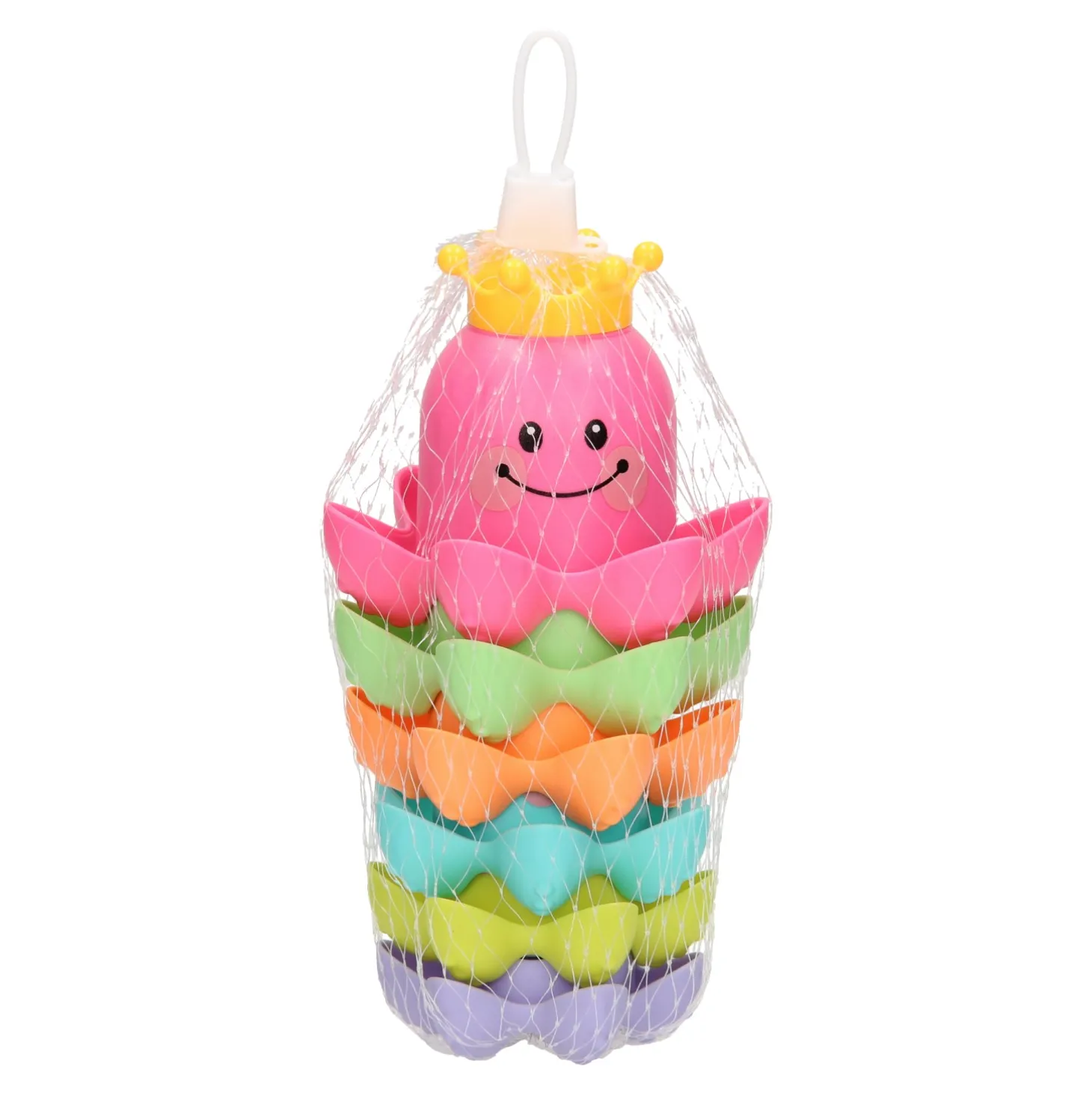 Met dit vrolijke badspeelgoed kun je de kleine wel even vermaken! De kunststof stapelbekers hebben de vorm van een octopus zijn bedrukt met een vrolijk gezichtje. Stapel de gekleurde bekers op elkaar of vul de bekertjes met water. Dankzij de gaatjes in het kroontje kunnen de bekers ook als gieter gebruikt worden.