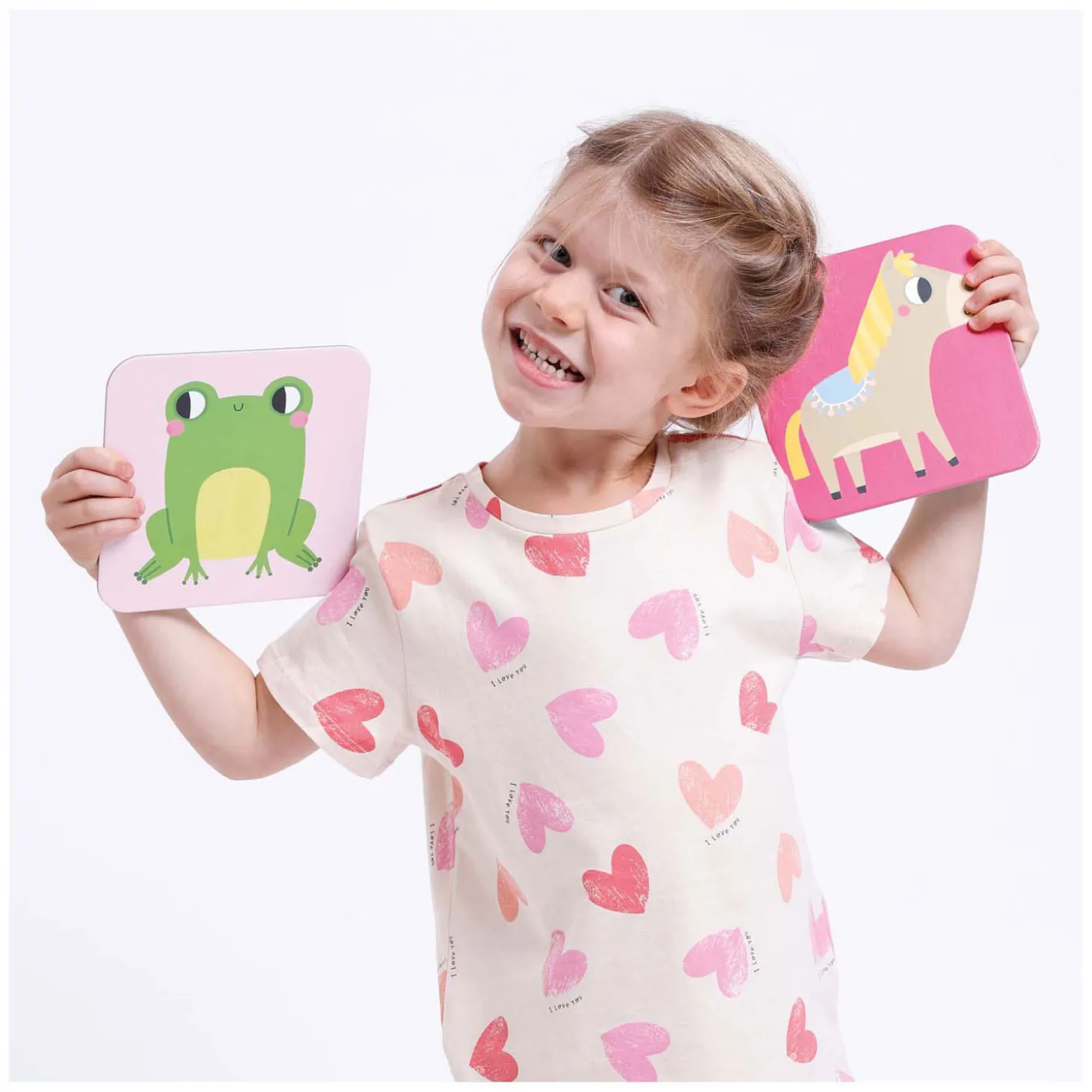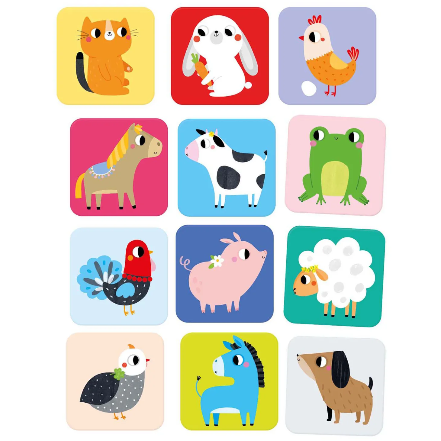 Begin met 2 of 3 paren en voeg andere dieren toe naarmate je kind vaardiger wordt. Spreid de kaarten open. Open twee kaarten tegelijk. Als ze hetzelfde zijn, leg je ze opzij; zo niet, draai je ze opnieuw om. De speler met de meeste paren wint.