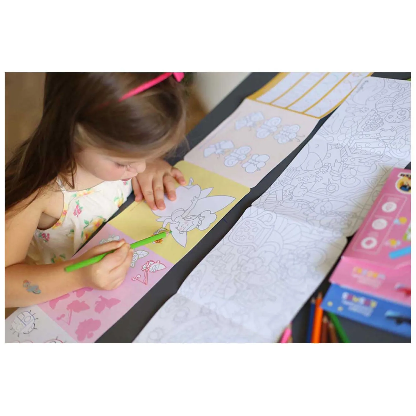 Bestaat uit 56 afzonderlijke enveloppen, elk met 2 extra lange (16×96 cm) kleurboeken.