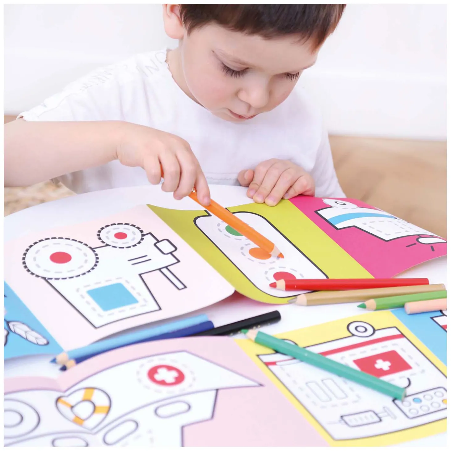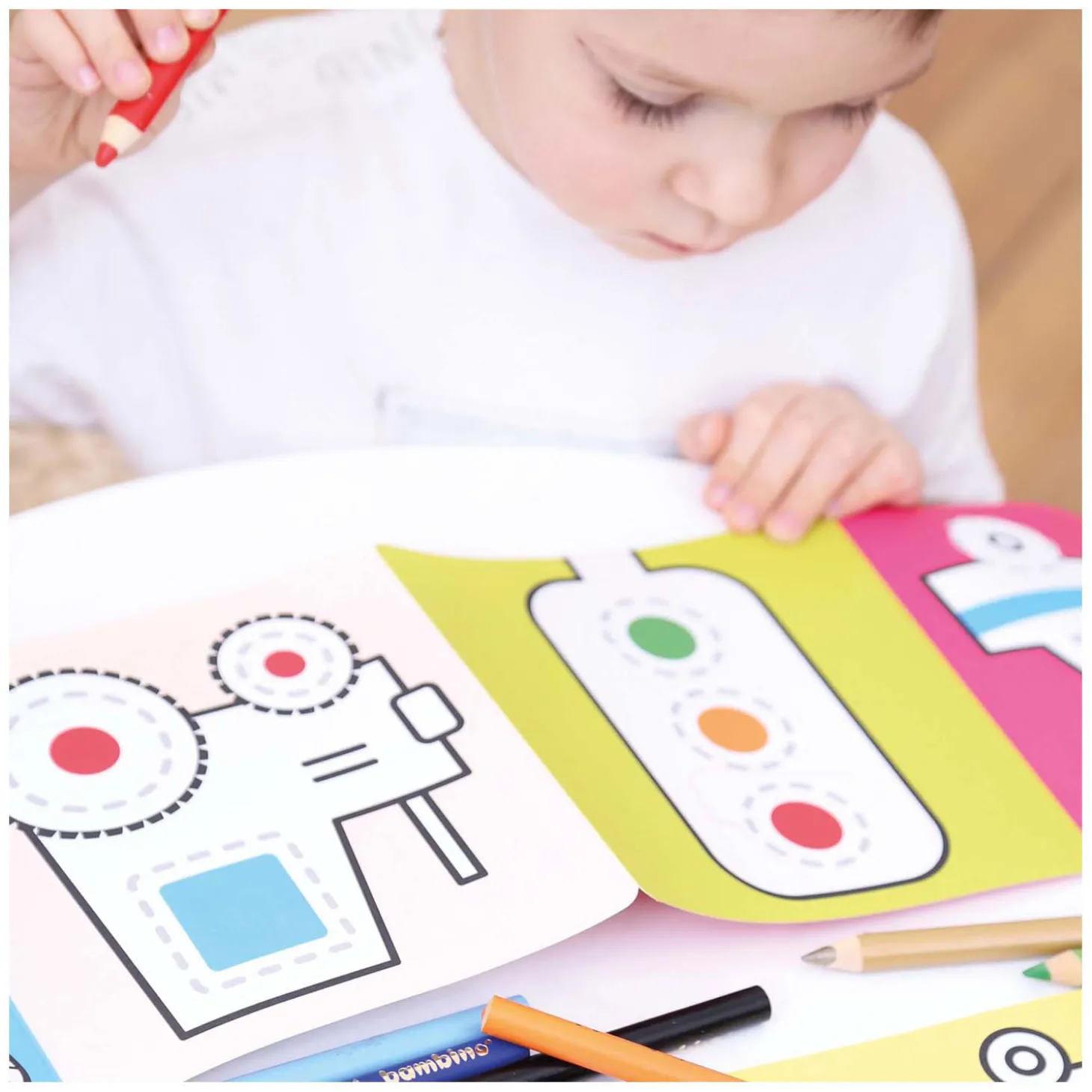 Dit populaire onderwerp en de leuke oefeningen motiveren kinderen om vormen na te bootsen en objecten steeds gedetailleerder te tekenen. Het is een natuurlijke introductie tot leren schrijven en tevens een middel tot creatieve expressie.