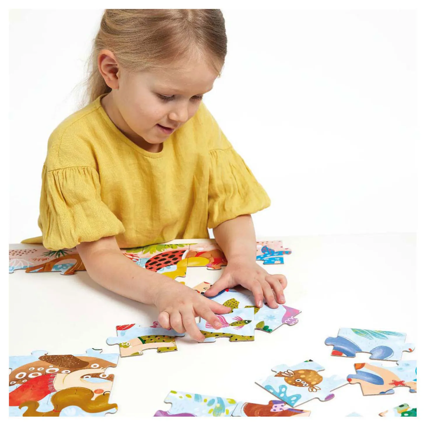 Deze grote puzzel bestaat uit 60 stukjes en toont de bewoners van het onderwaterrijk: vissen, schelpen en… magische zeemeerminnen! Puzzelen is een uitgebreide ontwikkelingsactiviteit waarmee kinderen hun fijne motoriek, observatie en geduld verbeteren. Het laat ook de kracht van verbeelding zien.