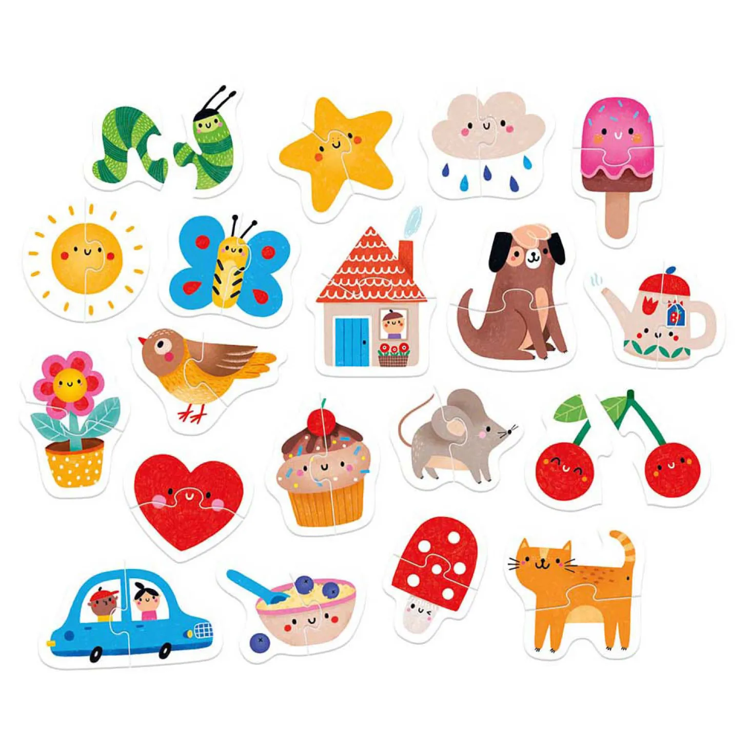 Gebruik de puzzeltijd om kleuren en nieuwe woorden te introduceren. Benoem wat er in elke illustratie staat en help je kind de verschillen en overeenkomsten te zien.