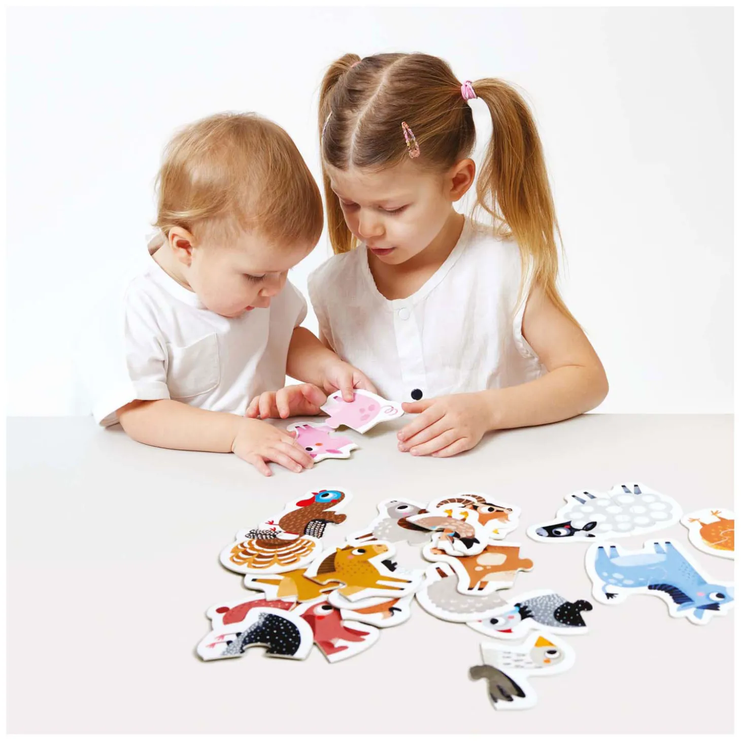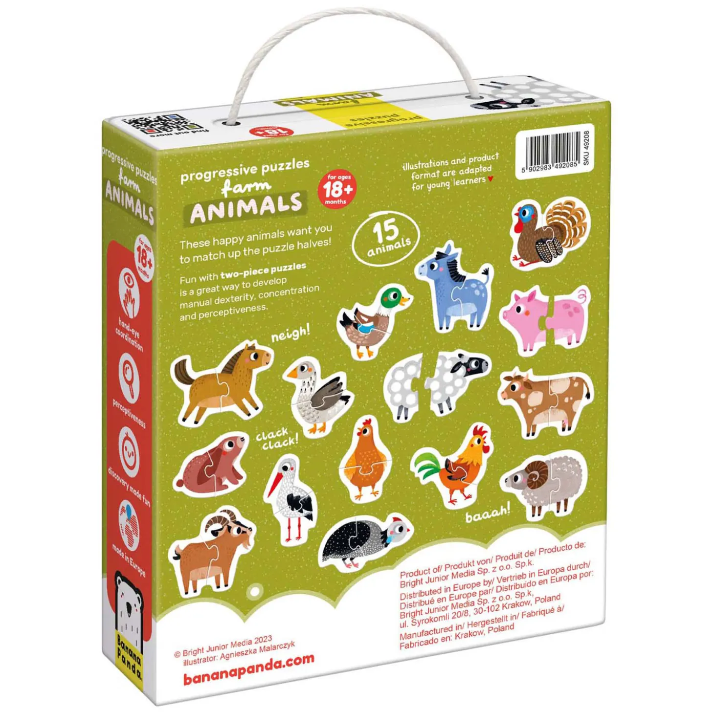 Maak kennis met de boerderijdieren puzzelset, een verzameling van 15 unieke puzzels die je kind eindeloze leeravonturen zullen bezorgen. Ga op reis door de charmante wereld van boerderijdieren terwijl je puzzels van verschillende moeilijkheidsgraden maakt, ontworpen om de puzzelvaardigheden van je kind geleidelijk te verbeteren.