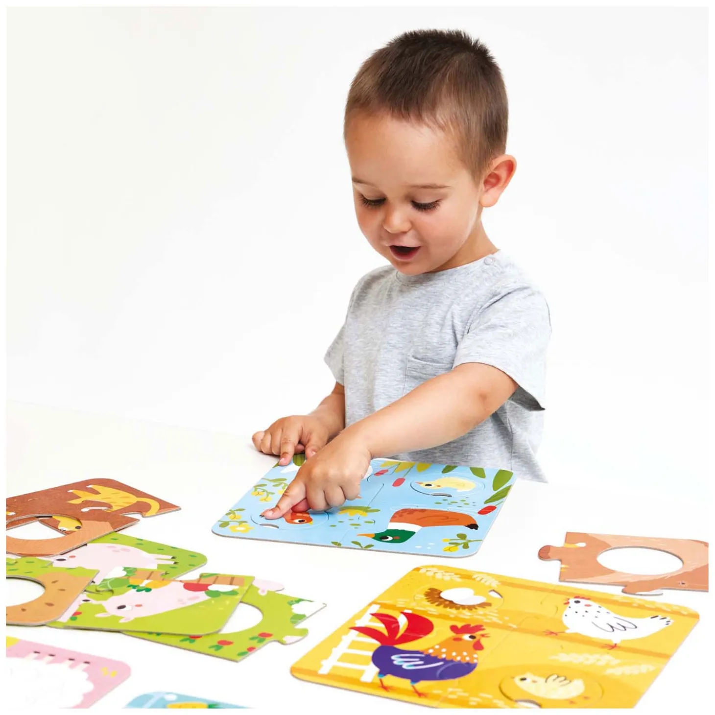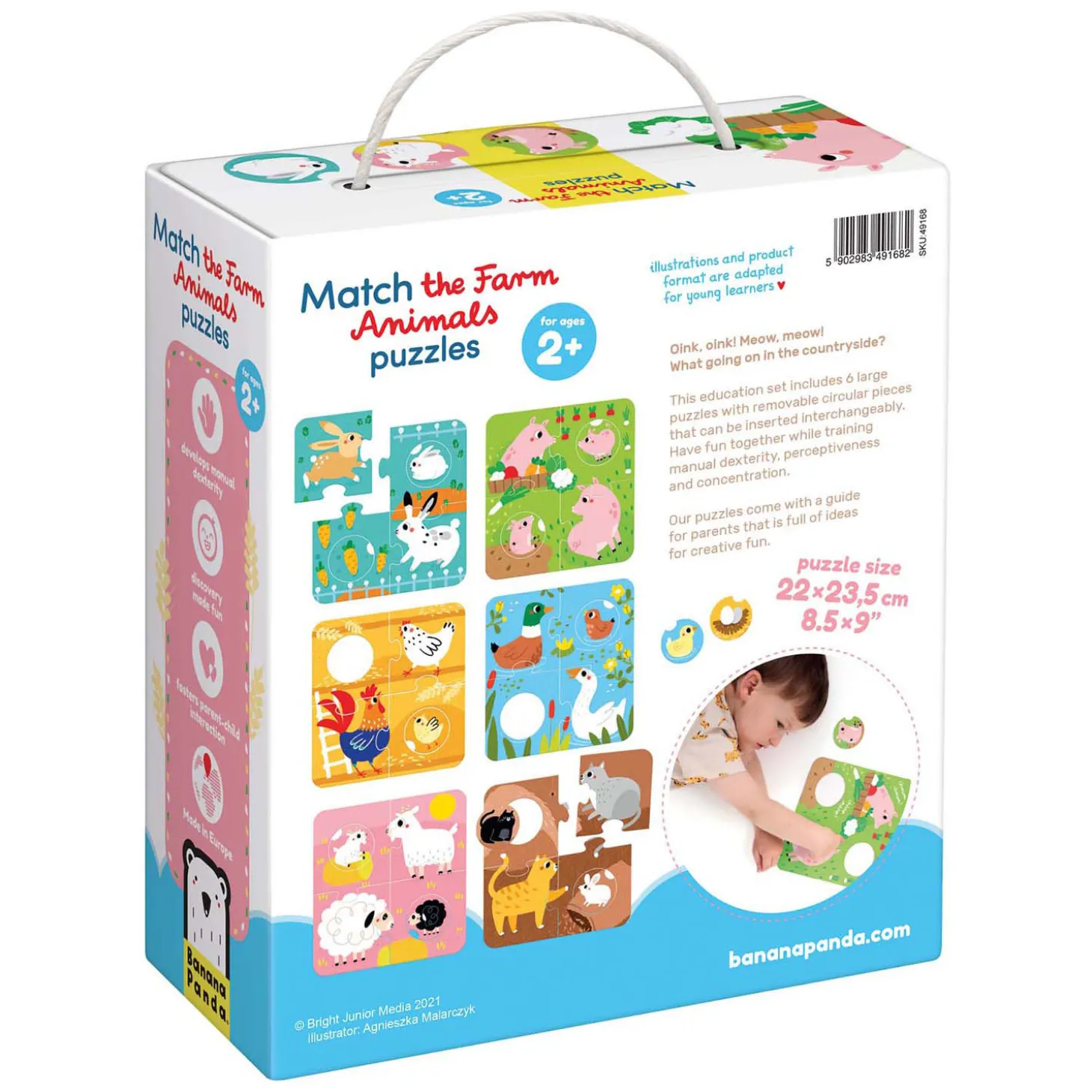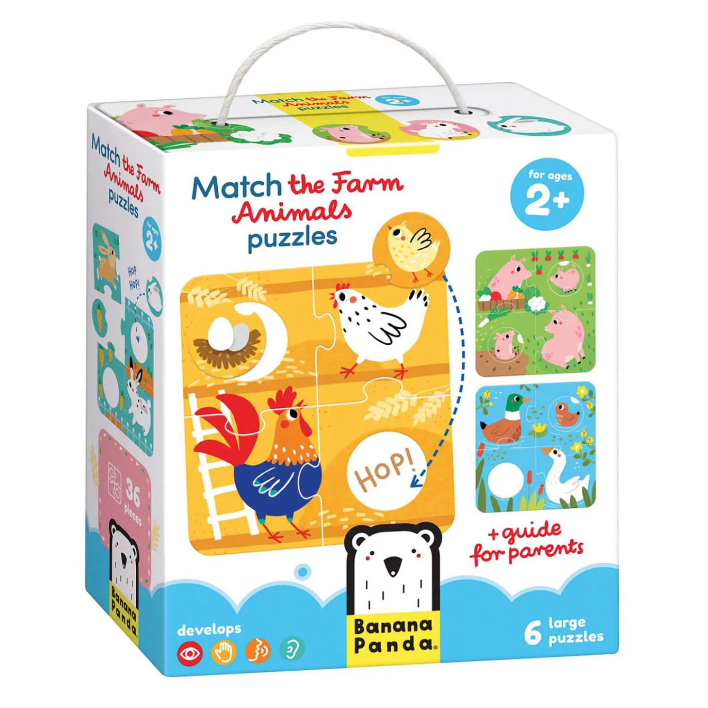 Ga op een leuk boerderijavontuur met de Match the Farm Animals-puzzel van Banana Panda, een leuke set van 6 grote puzzels van 4 stukjes die de aandacht van kleine kinderen zullen trekken en boeien, terwijl ze tegelijkertijd de vroege leerontwikkeling stimuleren.