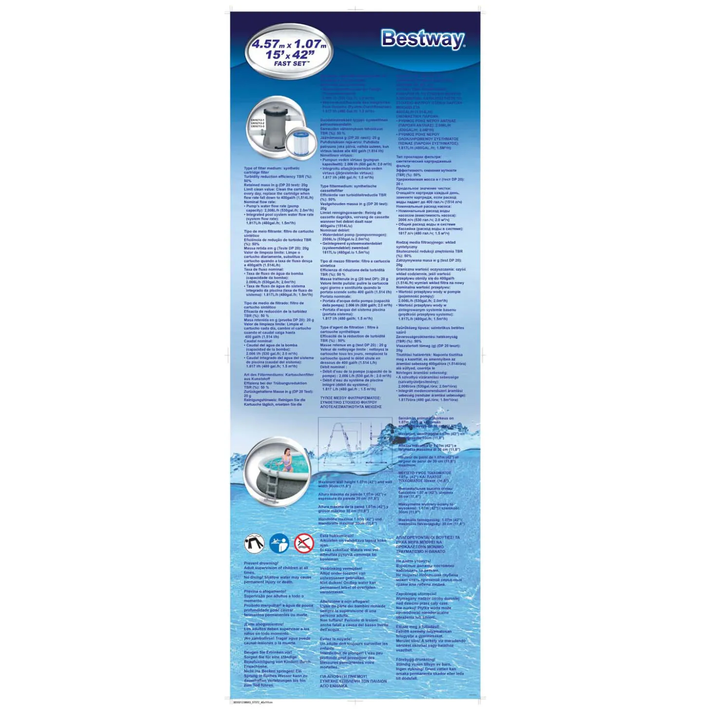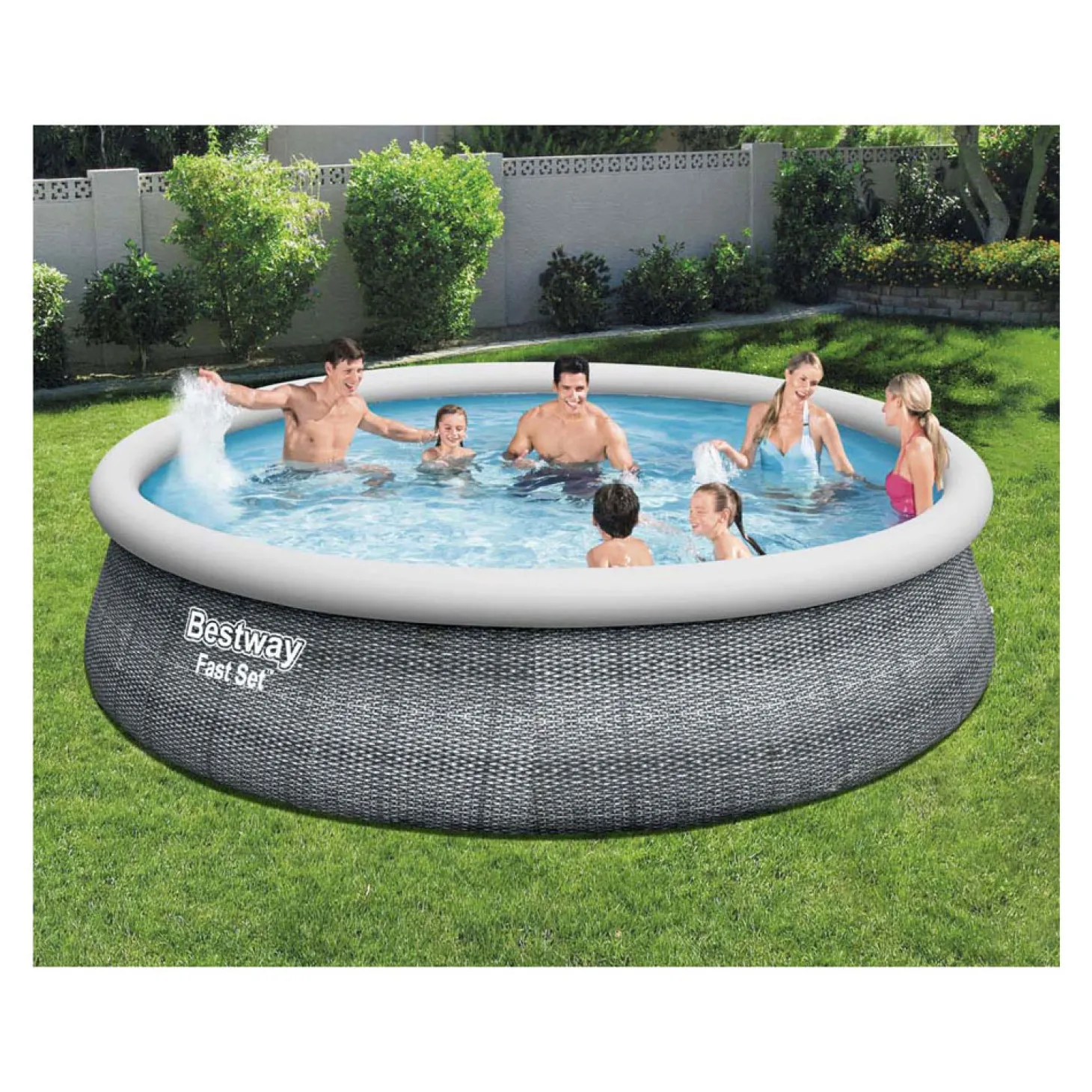 Het bekende fast set bad is nu verkrijgbaar in rotanlook. Gemakkelijk op te zetten zwembad met opblaasrand. Het bad waterpas leggen, de rand opblazen en dan vullen met water. Gemaakt van Tritech materiaal en met aftapplug. Wordt geleverd incl. filterpomp 2,0 m³/u met filter, trap en cover. Watercapaciteit: 12.362 ltr. Afmeting: Ø 457×107 cm.