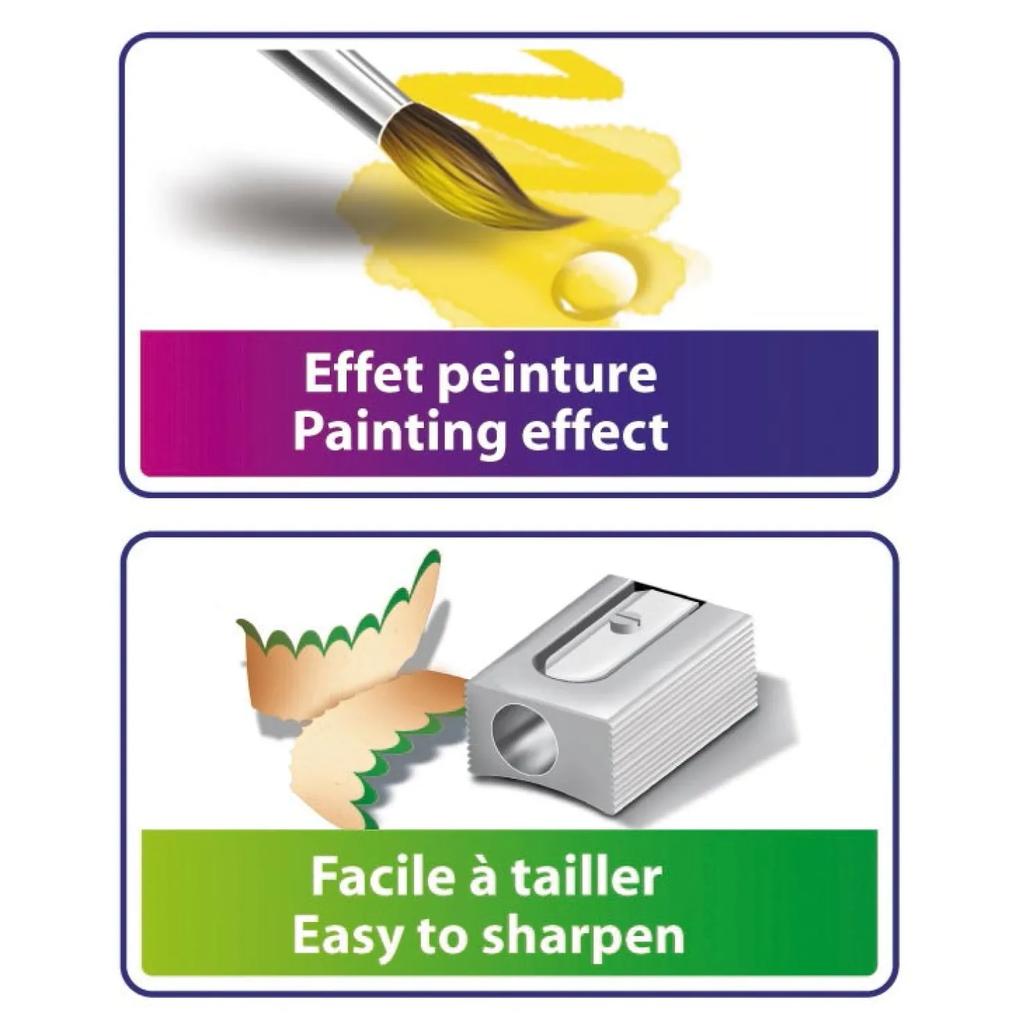 Etui met 12 BIC aquarelpotloden. Dit potlood kan dubbel gebruikt worden: als klassiek potlood of als aquarelpotlood door het potlood in water te dompelen of door de tekening te bewerken met een nat penseel. Hierdoor kan het effect verkregen worden van een aquarelschilderij.