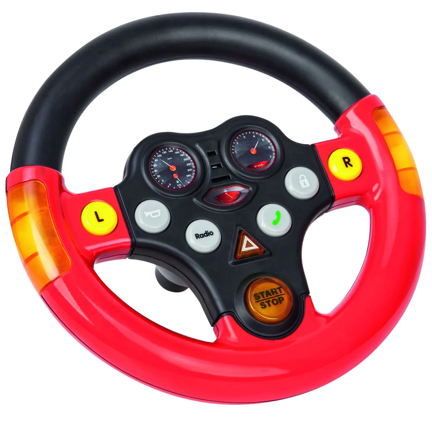 Heb je een BIG Bobby Car of een BIG New Bobby Car en wil je wel iets meer actie tijdens het rijden op deze mooie loopauto’s? Kies dan voor het BIG Speelstuur met Geluid. Met dit stuur vervang je gemakkelijk de stuur die al op een BIG Bobby Car of een BIG New Bobby Car vastzit. Druk de knopjes in van het speelstuur en je hoort echte auto- en racegeluiden. Ook knipperen aan beide kanten van het stuur lampjes. Autorijden wordt nu echt een beleving! Werkt op 3x AAA batterijen (batterijen zijn meegeleverd).
