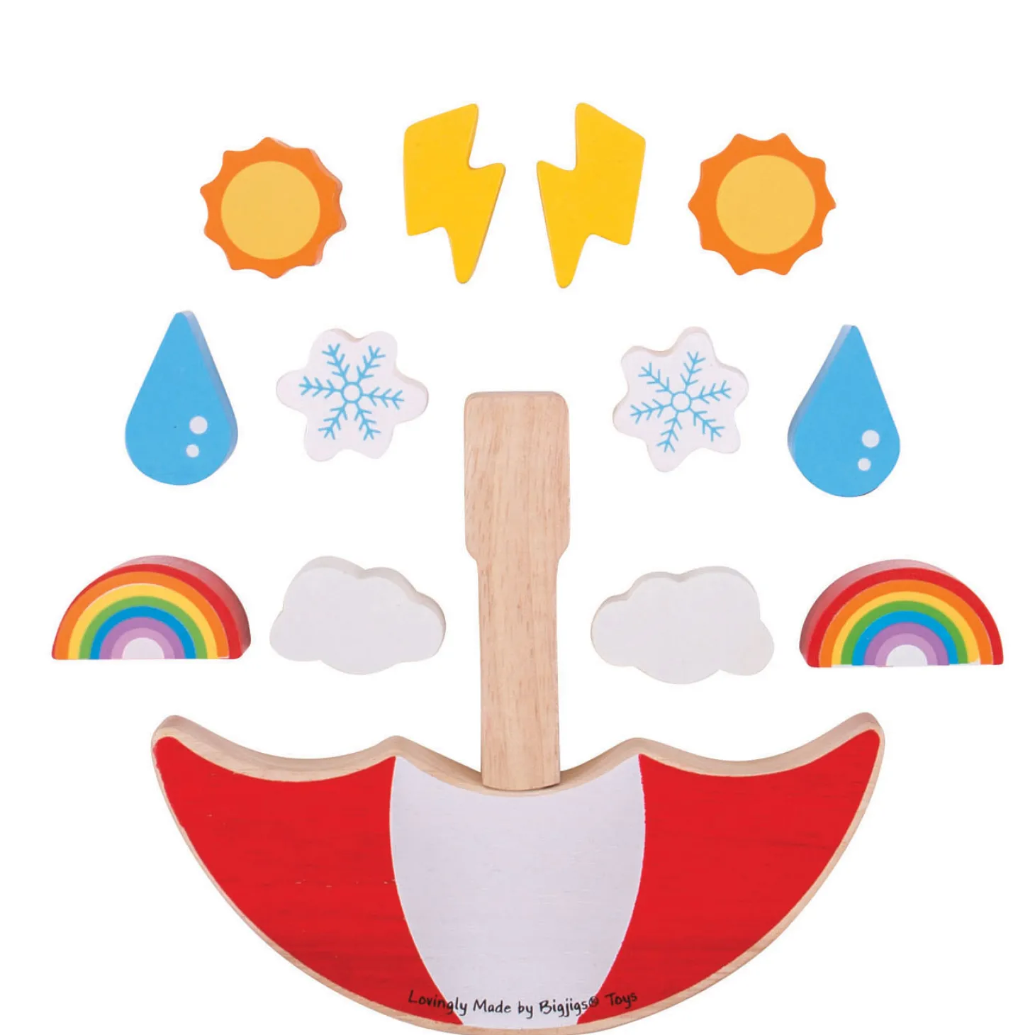 Wat ziet het er vrolijk uit, dit Houten Balansspel Weer! Plaats de grote rood met wit gestreepte paraplu ondersteboven en probeer hier de zonnetjes, wolkjes, regendruppels, regenboogjes, sneeuwvlokjes en bliksemflitsen bovenop te plaatsen. Lukt het jou en je vrienden om ze allemaal te plaatsen, zonder dat ze vallen in dit Houten Balansspel Weer?