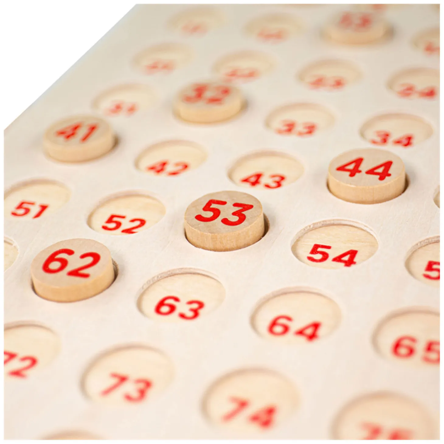 Inhoud: 105 houten fiches, bingobord, en bingokaarten in 4 verschillende kleuren.
