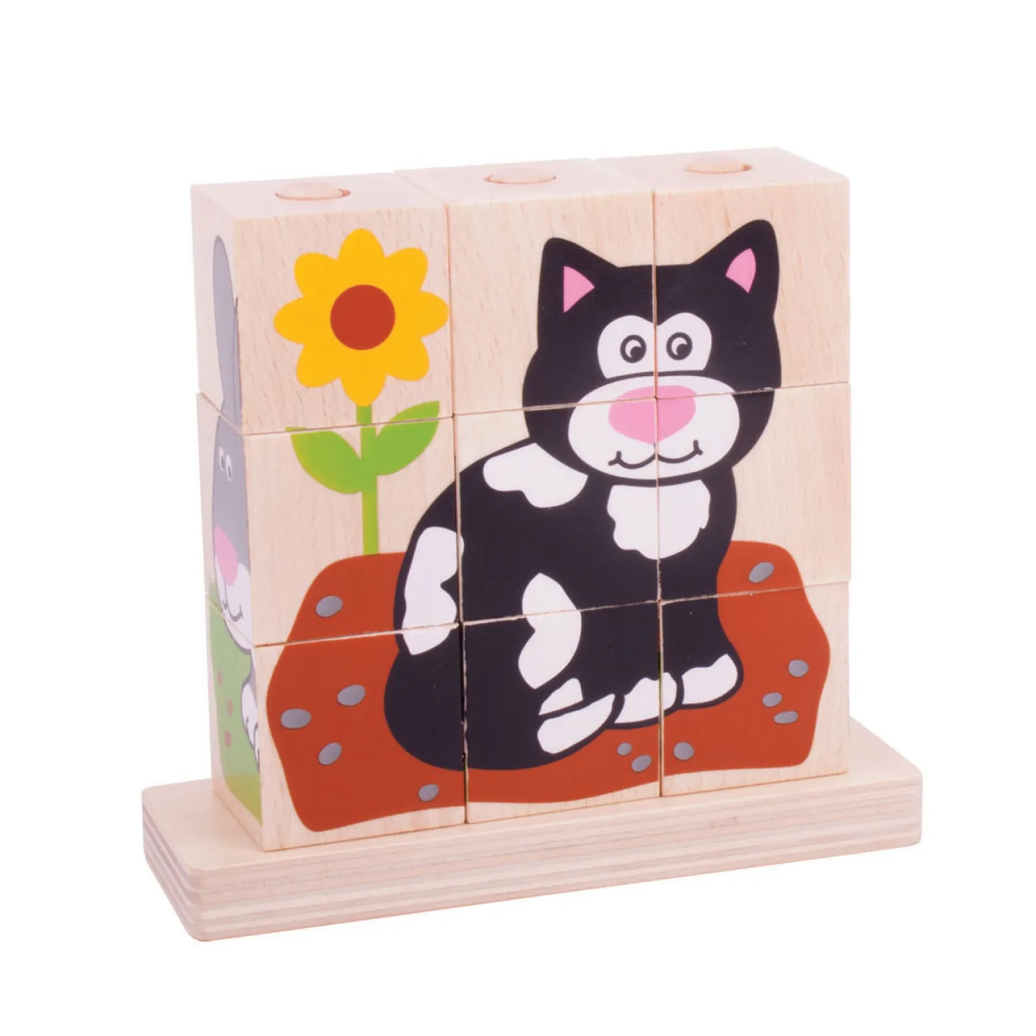 Zoek de juiste houten puzzelstukjes bij elkaar en maak de huisdieren compleet. Maak een poes, hond, hamster of een konijn. De puzzelblok bestaat uit een puzzelhouder en 9 puzzelstukken. Geschikt voor kinderen vanaf 12 maanden.