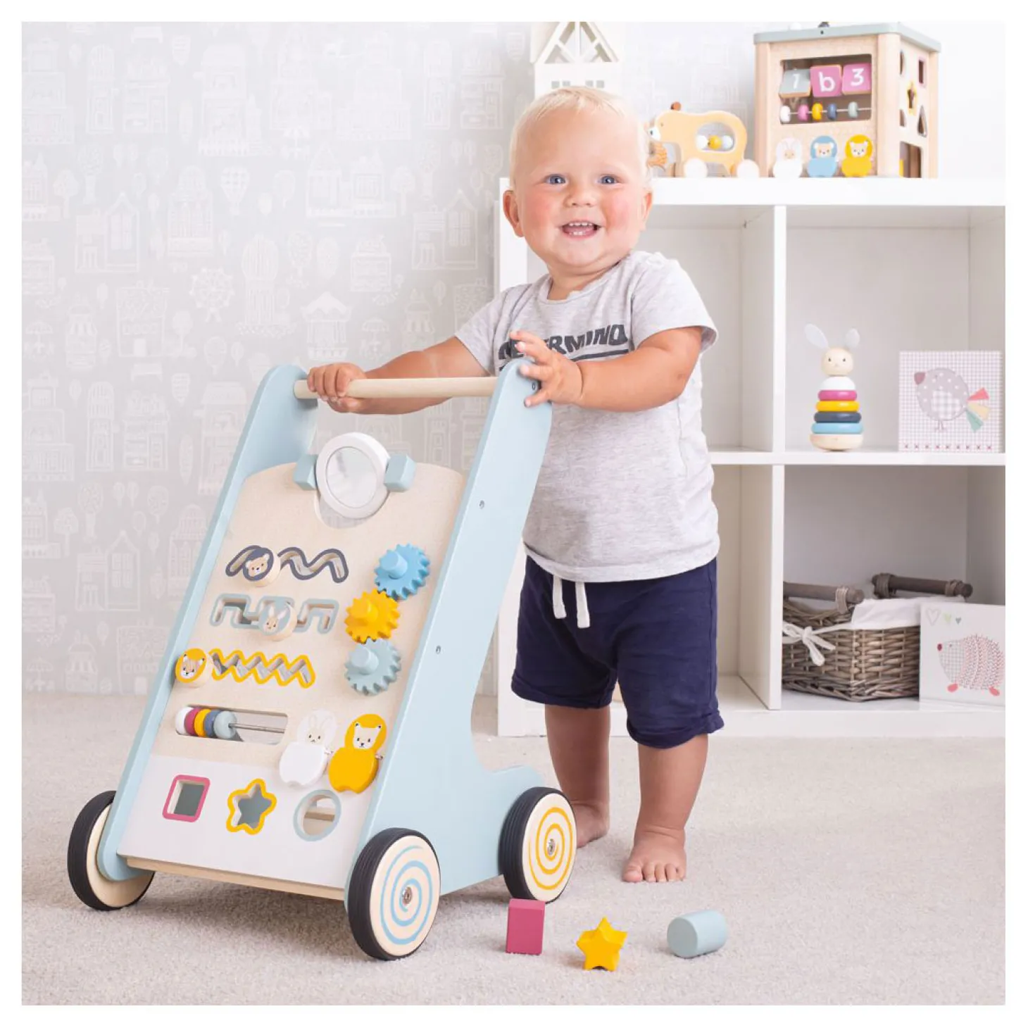 Onze 100% FSC-gecertificeerde houten loopwagen is ideaal voor leuke en leerzame speeltijd met peuters die nog maar net op de been zijn! Deze activiteitenwandelaar zit boordevol spannende en vermakelijke activiteiten die zeker voor urenlang speelplezier zullen zorgen. Gemaakt van duurzaam geproduceerde FSC®-gecertificeerde materialen, FSC® C147826. Onze loopwagen heeft opvallende neutrale kleuren en een decor geïnspireerd op wilde dieren in het bos met verschillende activiteiten om kleine handjes bezig te houden – van een vormensorteerder en draaiende tandwielen tot een omklapbare spiegel en kleurrijke kralen en meer om jonge geesten te vermaken en te stimuleren. Babyduwrekken zijn een geweldige manier om vertrouwen op te bouwen tijdens het lopen. Ontwikkelt hand/oogcoördinatie, fijne motoriek, sorteer- en matchvaardigheden en behendigheid. Vereist montage voor volwassenen. Gemaakt van hoogwaardige, verantwoorde materialen. Voldoet aan de huidige Europese veiligheidsnormen. De loopwagen vereist montage door volwassenen.