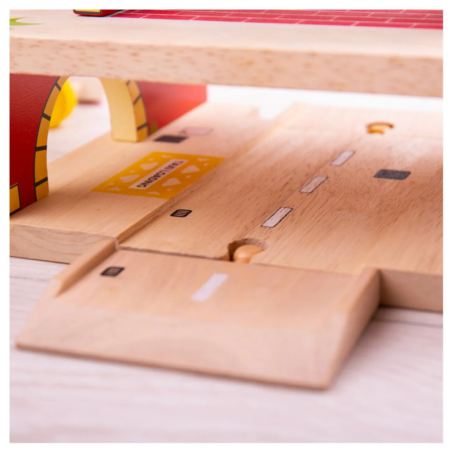 Dit felgekleurde houten bovengrondse station stelt weggebruikers in staat om onder het station door te gaan als de trein (apart verkrijgbaar) aankomt en vertrekt op het hogere platform. Verbindt het houten spoor en de rijbaan met elkaar, zodat kinderen genoeg hebben om mee te werken!