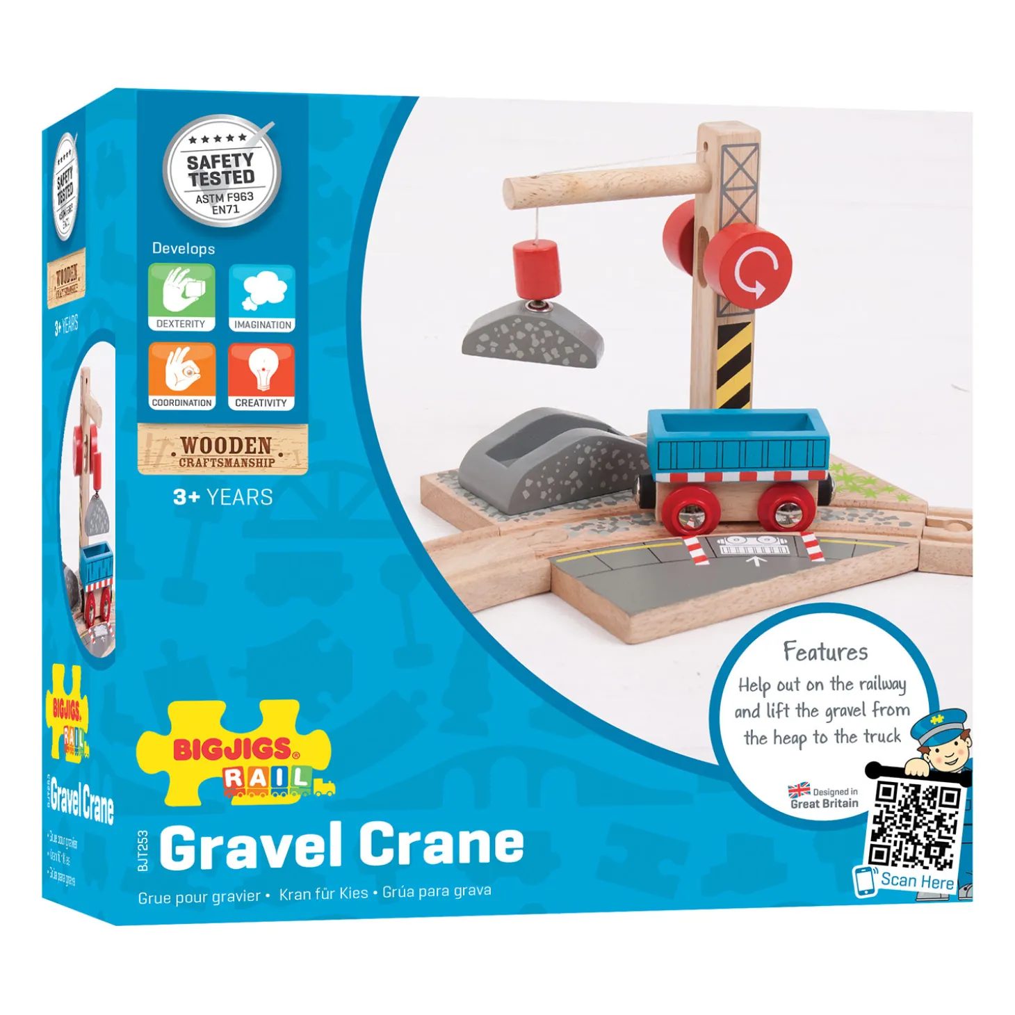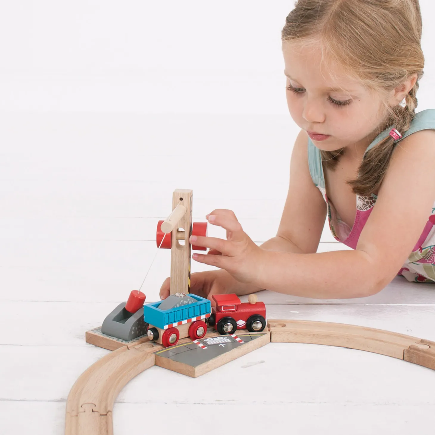 Inhoud: Platform met een hijskraan en een rails, 1 wagon, 1 houten blok grind.