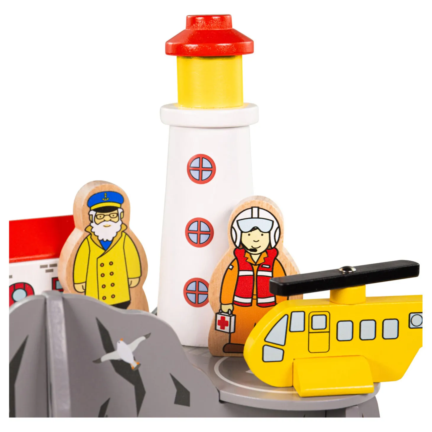 Voeg de vuurtoren toe als uitbreiding aan je houten treinbaan. Laat de speelgoedtrein onder de vuurtoren doorrijden om veilig naar de andere kant te gaan. Liefhebbers van minitreinen kunnen hun eigen zoek- en reddingsmissie op zee opzetten met de helikopter en het houten spoorwegnet om te helpen.