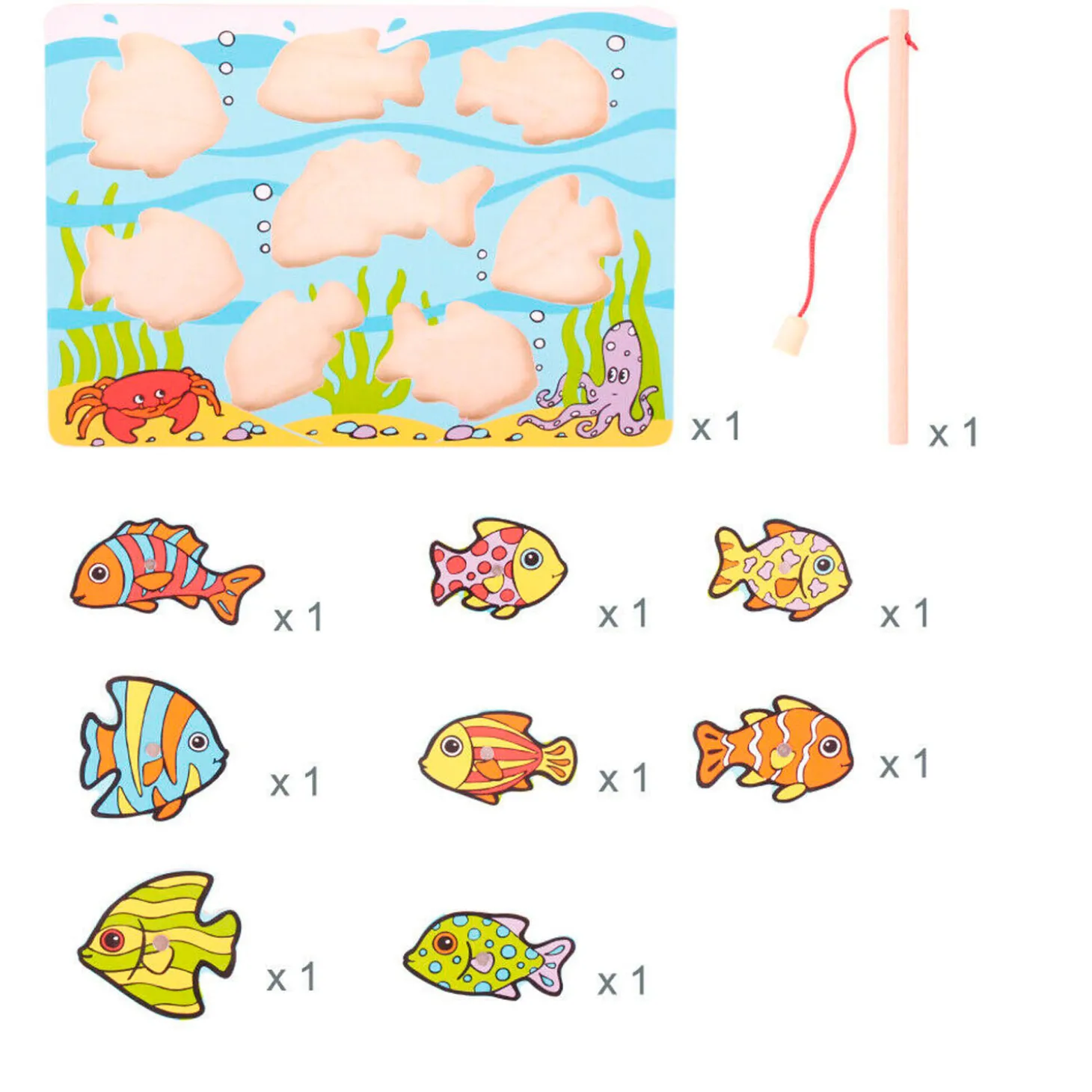 Niet aan de waterkant, maar thuis vissen vangen! Het Magnetisch Visspel bestaat uit een houten ondergrond van 30×21 centimeter, 8 kleurrijke houten vissen en een vishengel met magneet. Puzzel de vissen in het juiste gat van het Magnetisch Visspel en vang ze daarna met de vishengel.