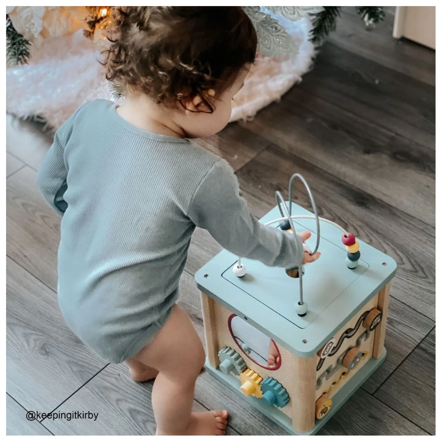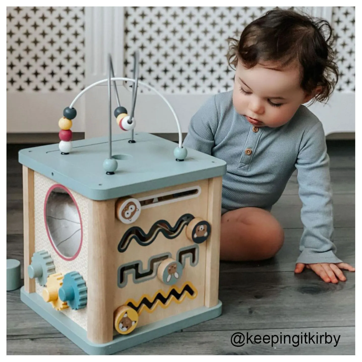 Elk van de vier kanten zit boordevol verschillende activiteiten om jongeren te helpen leren door middel van educatief spel. Activiteiten zijn onder andere: een vormensorteerder, een kralenonderzetter, houten tandwielen en nog veel meer. Het zachte kleurenpalet maakt dit houten babyspeelgoed geschikt voor zowel meisjes als jongens. De houten activiteitenkubus is perfect voor het ontwikkelen van de sociale, communicatieve en rekenvaardigheden van peuters terwijl ze draaien, draaien en tellen. Dit houten speelgoed is gemaakt van FSC®-gecertificeerde materialen (FSC® C147826) en is op de meest ethische manier gemaakt. De kwaliteit van het hout betekent ook dat de activiteitenkubus is gebouwd om lang mee te gaan en nog vele jaren mee zal gaan!
