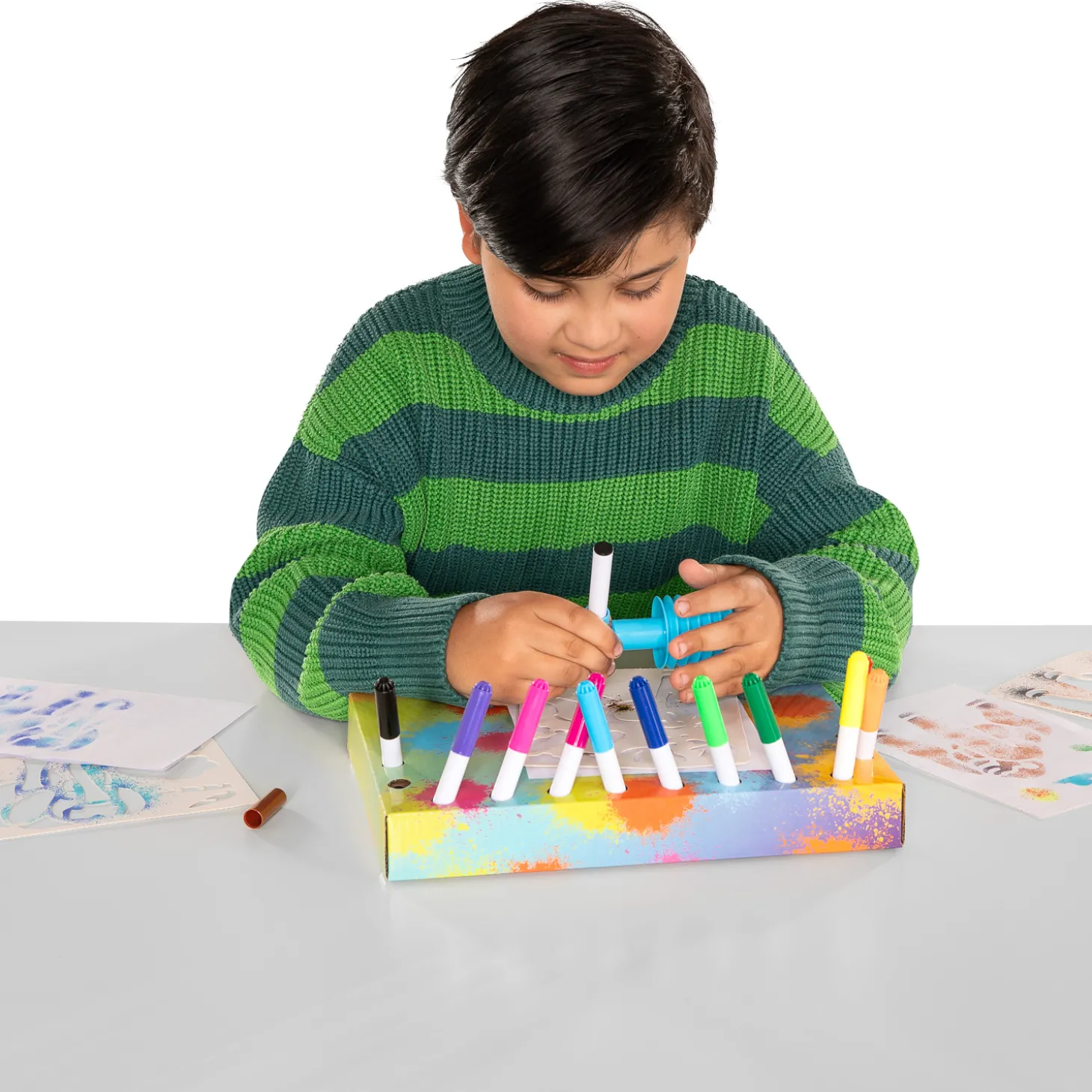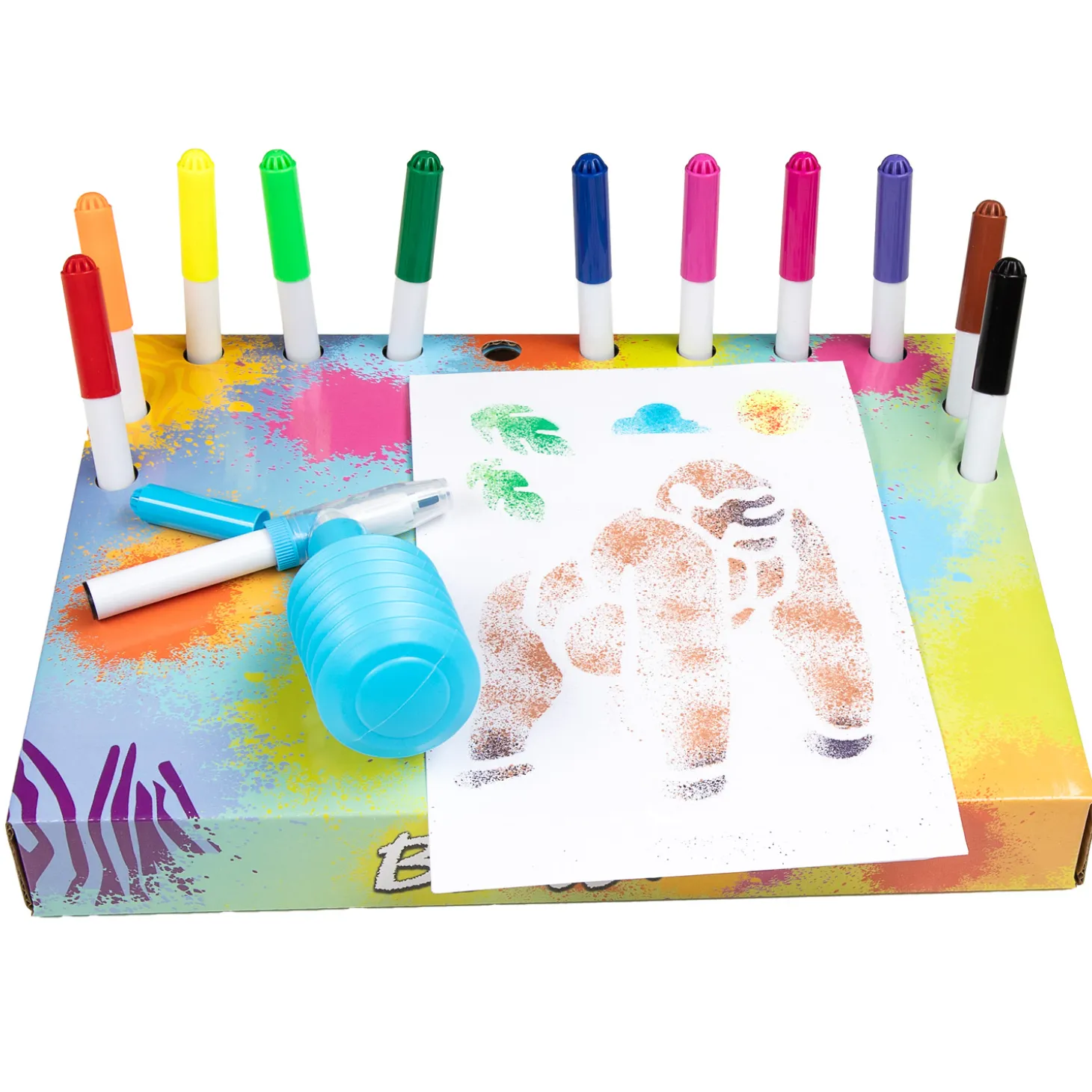 Inclusief 8 vellen papier en een kartonnen bord waar je de stiften in kunt zetten en je kunstwerken op kan maken. Geschikt voor kinderen van 4 jaar en ouder.