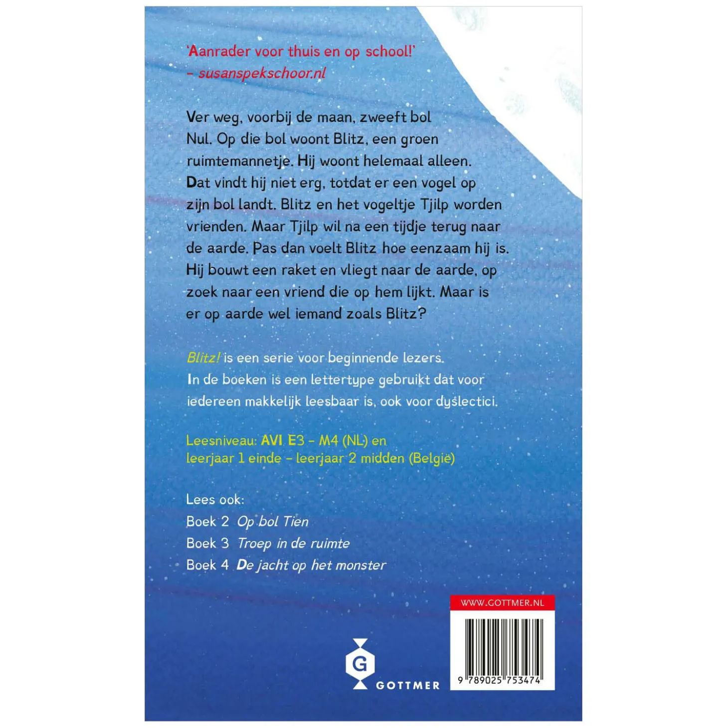 Ver weg, voorbij de maan, zweeft bol Nul. Op die bol woont Blitz, een groen ruimtemannetje. Hij woont helemaal alleen. Dat vindt hij niet erg, totdat er een vogel op zijn bol landt. Blitz en het vogeltje Tjilp worden vrienden. Maar Tjilp wil na een tijdje terug naar de aarde. Pas dan voelt Blitz hoe eenzaam hij is. Hij bouwt een raket en vliegt naar de aarde, op zoek naar een vriend die op hem lijkt. Maar is er op aarde wel iemand zoals Blitz?