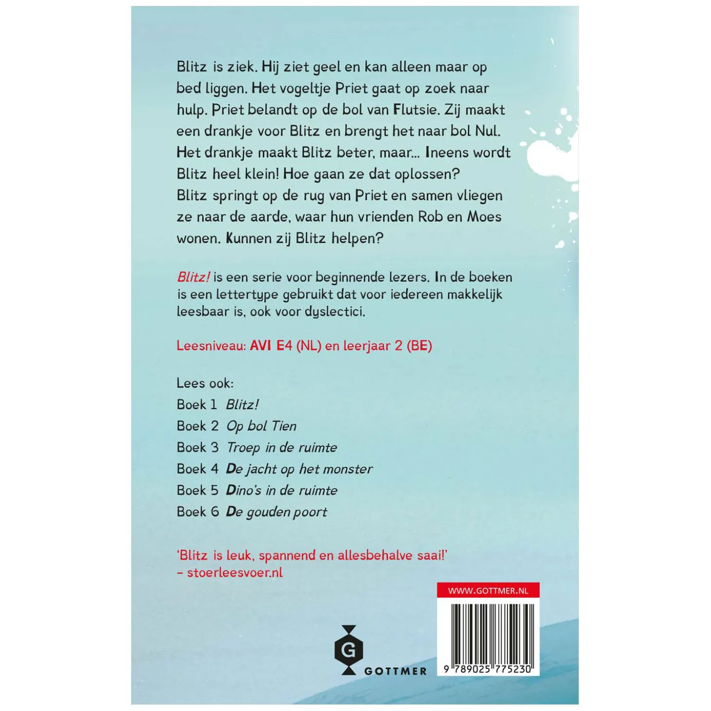 Blitz is ziek. Hij ziet geel en kan alleen maar op bed liggen. Het vogeltje Priet wil hem beter maken en gaat op zoek naar hulp. Priet komt terecht op de bol van Flutsie, die een drankje voor Blitz maakt. Het drankje werkt, maar heeft ook een nare bijwerking: Blitz wordt niet alleen beter, maar ook heel klein! Hoe gaan ze dat oplossen? Naar Flutsie gaan durft Blitz niet. Hij springt op de rug van Priet en samen vliegen ze naar de aarde, waar Rob en Moes wonen. Zouden zij hem kunnen helpen?