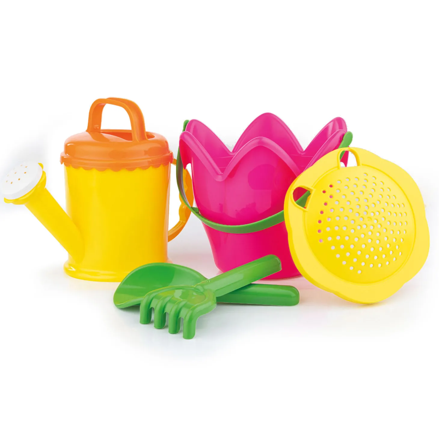 Deze 5-delige strandset is voorzien van vrolijke kleurtjes. Naast de 16 centimeter hoge emmer en gieter bevat de set een schep, een zeef en een hark.