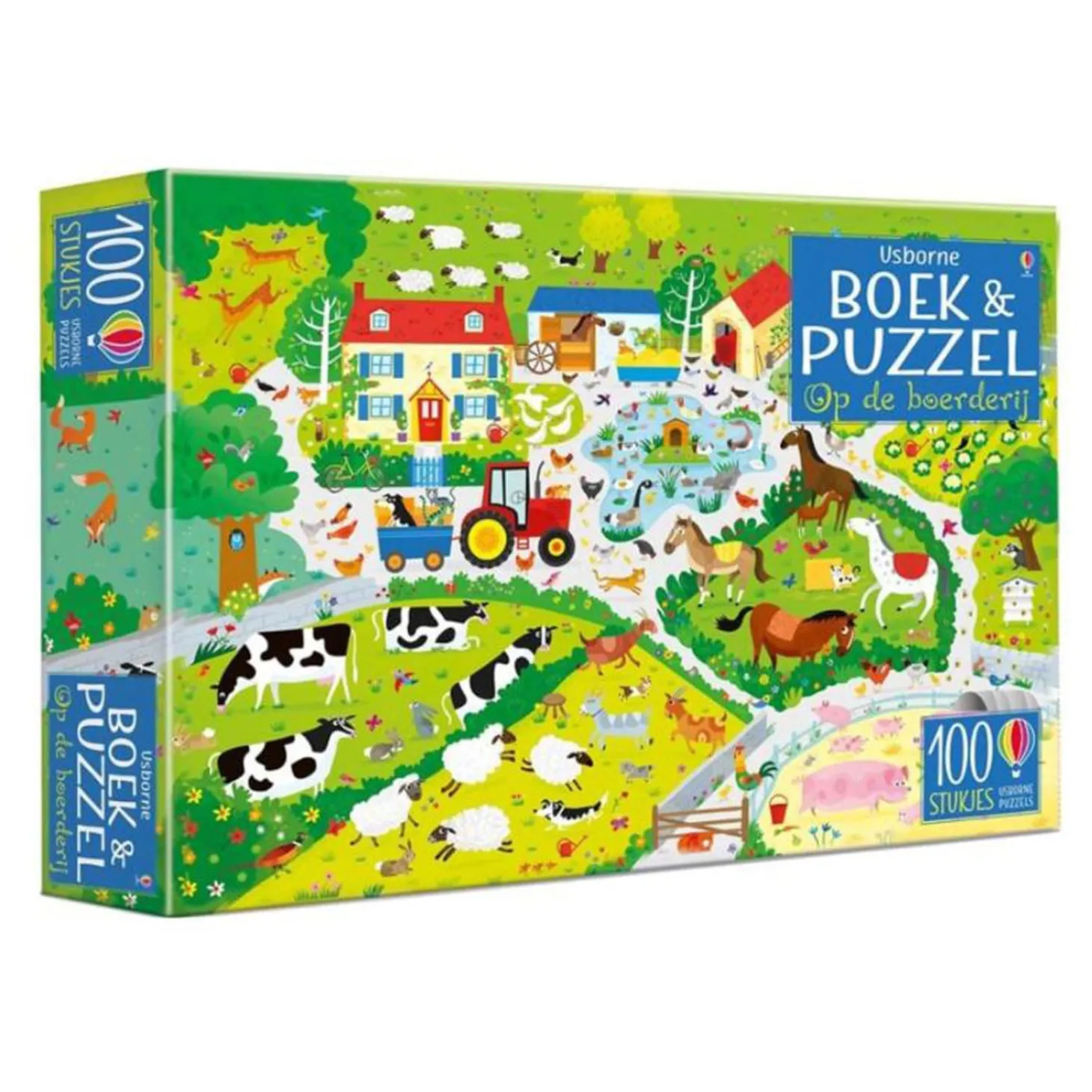 Samen in een kleurige, stevige doos: een levendige puzzel van 100 stukjes met een afbeelding van een boerderij waar van alles gebeurt, en een kleurig puzzelboekje van 24 pagina’s. De puzzel is 59 x 40 cm groot en zowel de puzzel als het puzzelboek staat vol dingen om te ontdekken en over te praten. Zie je een koe met een bel, vijf vossen, een plastic eendje, en nog veel meer?