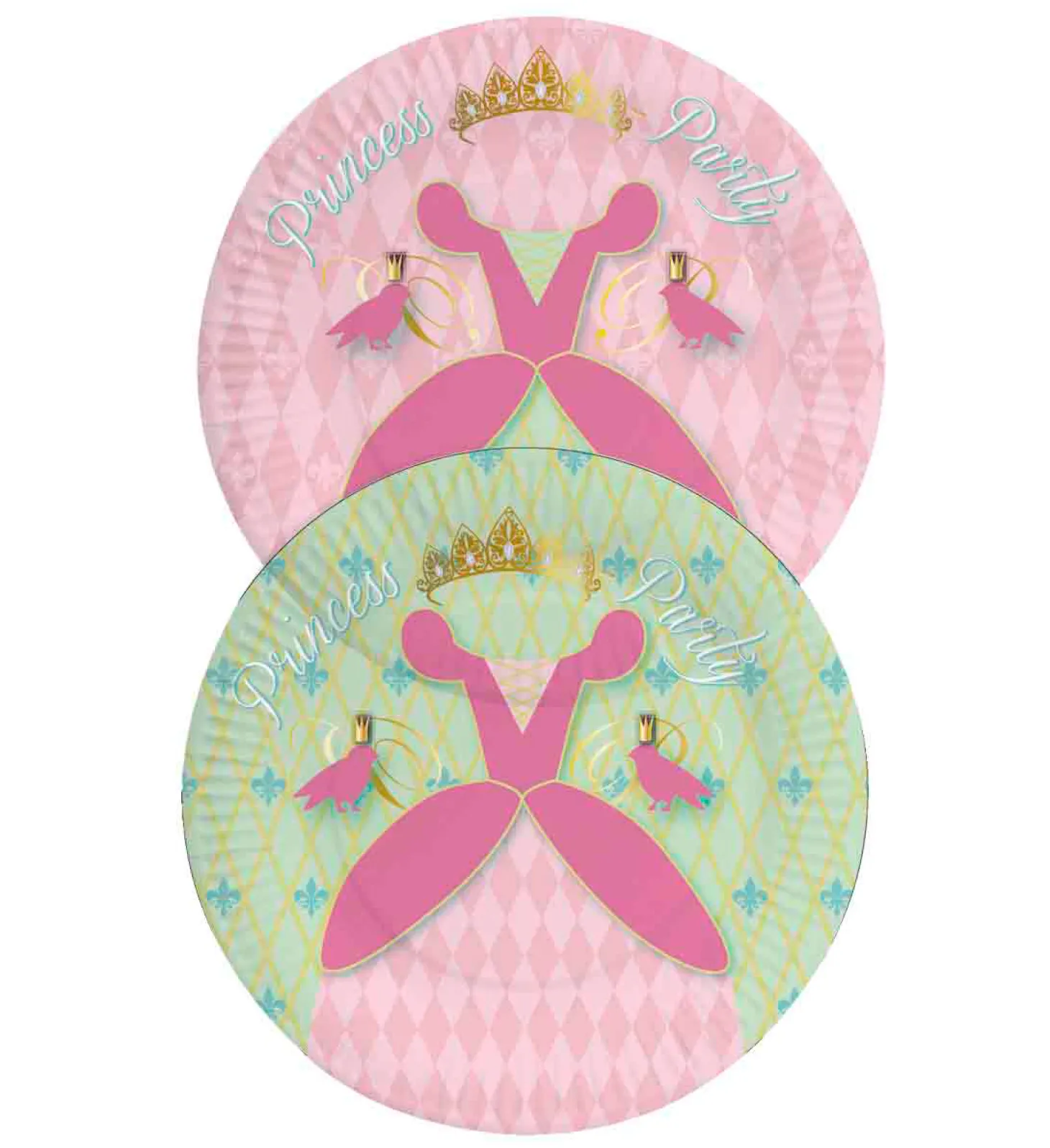 Set van 8 kartonnen bordjes om jouw Princess party helemaal compleet te maken.Prijs per stuk, verschillende uitvoeringen/kleuren worden door elkaar geleverd.