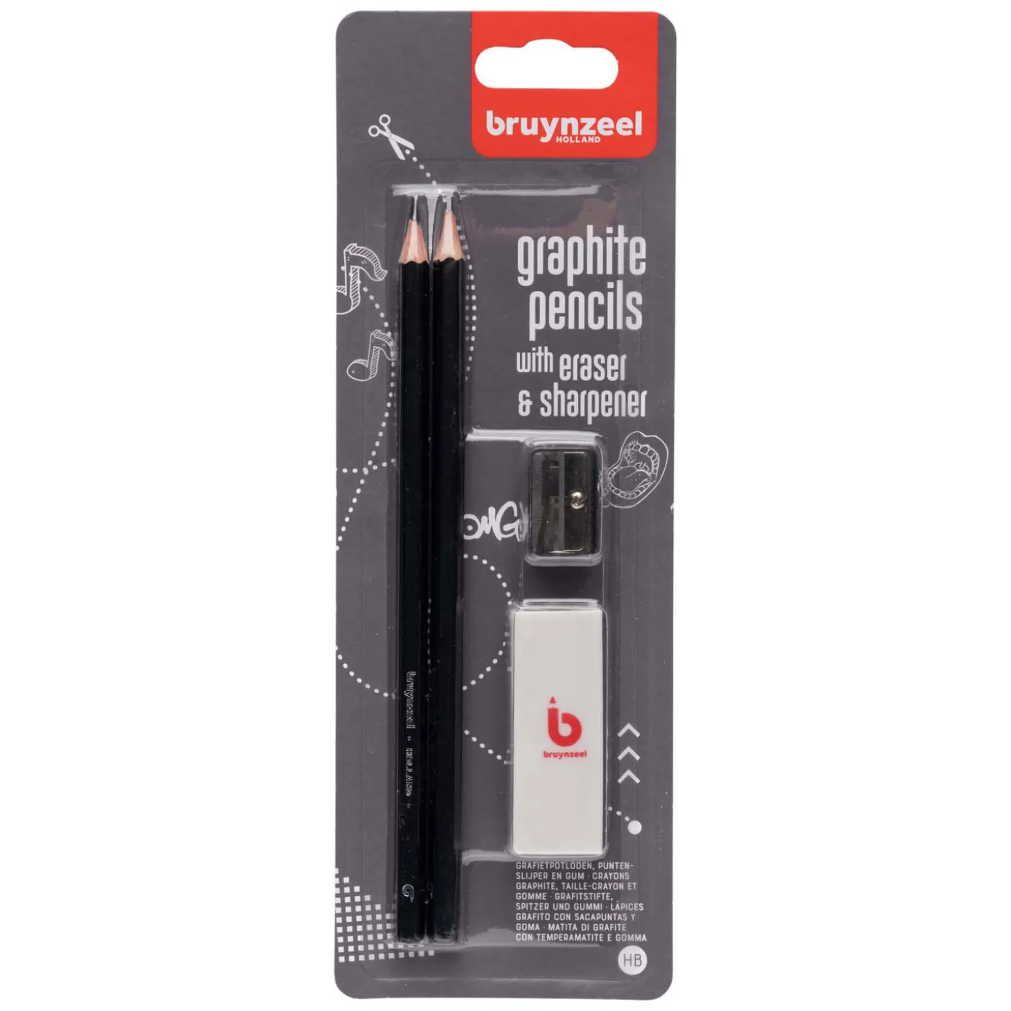 Blister met 2 HB grafietpotloden, een puntenslijper en een gum.