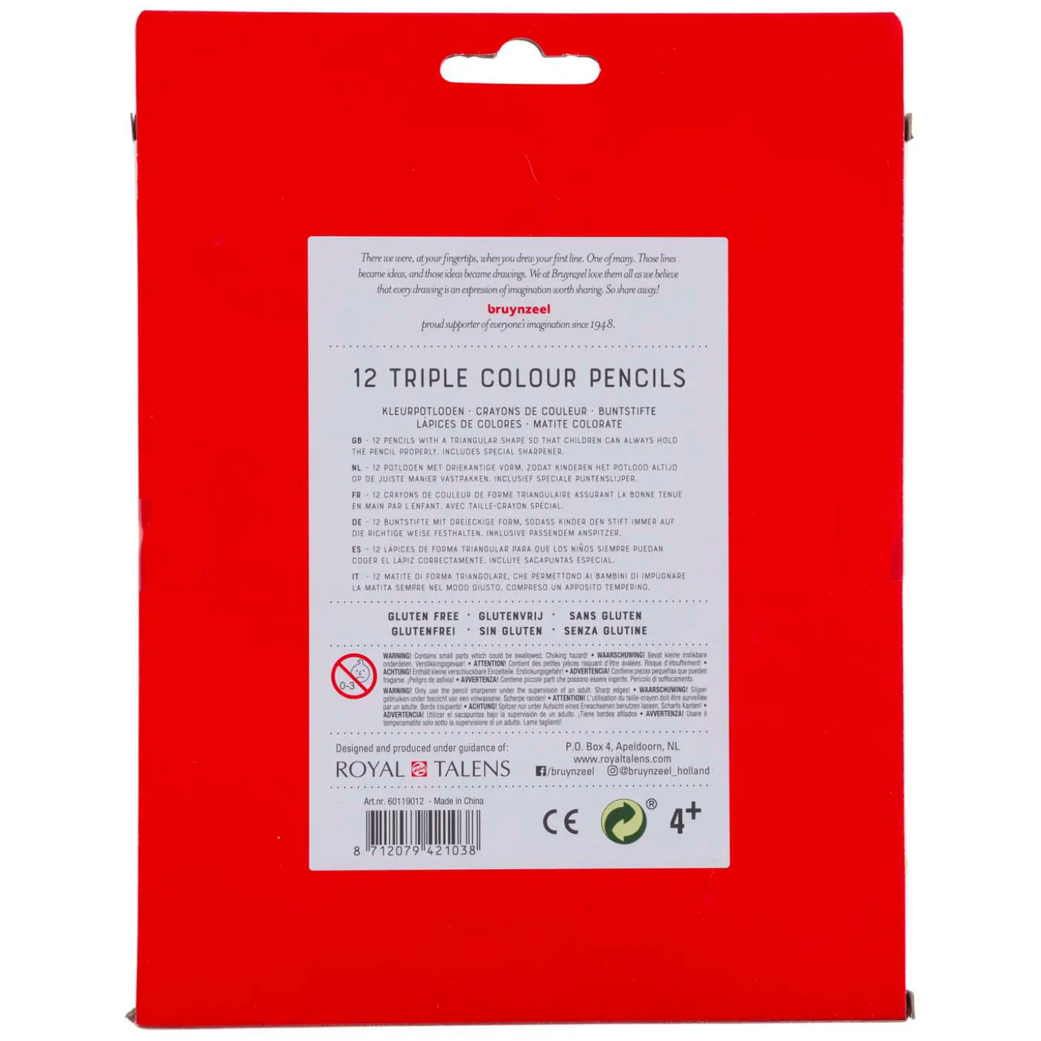 met de driehoekige kleurpotloden van Bruynzeel heeft elk kleintje direct een goede grip op het potlood! Dit is niet alleen erg fijn, maar ook erg leerzaam, want het leert kinderen de juiste schrijfpositie aan te nemen! De verpakking bevat 12 driehoekige potloden in de meest populaire kleuren en een bijbehorende puntenslijper. Geschikt voor kinderen vanaf 4 jaar. Kenmerken: Ergonomische driehoekige grip – Goede kleurweergave – Pigmenten van hoogwaardige kwaliteit – Intense kleuren – Kleurkern met dubbele verlijming – Verantwoord verkregen hout – Glutenvrij.
