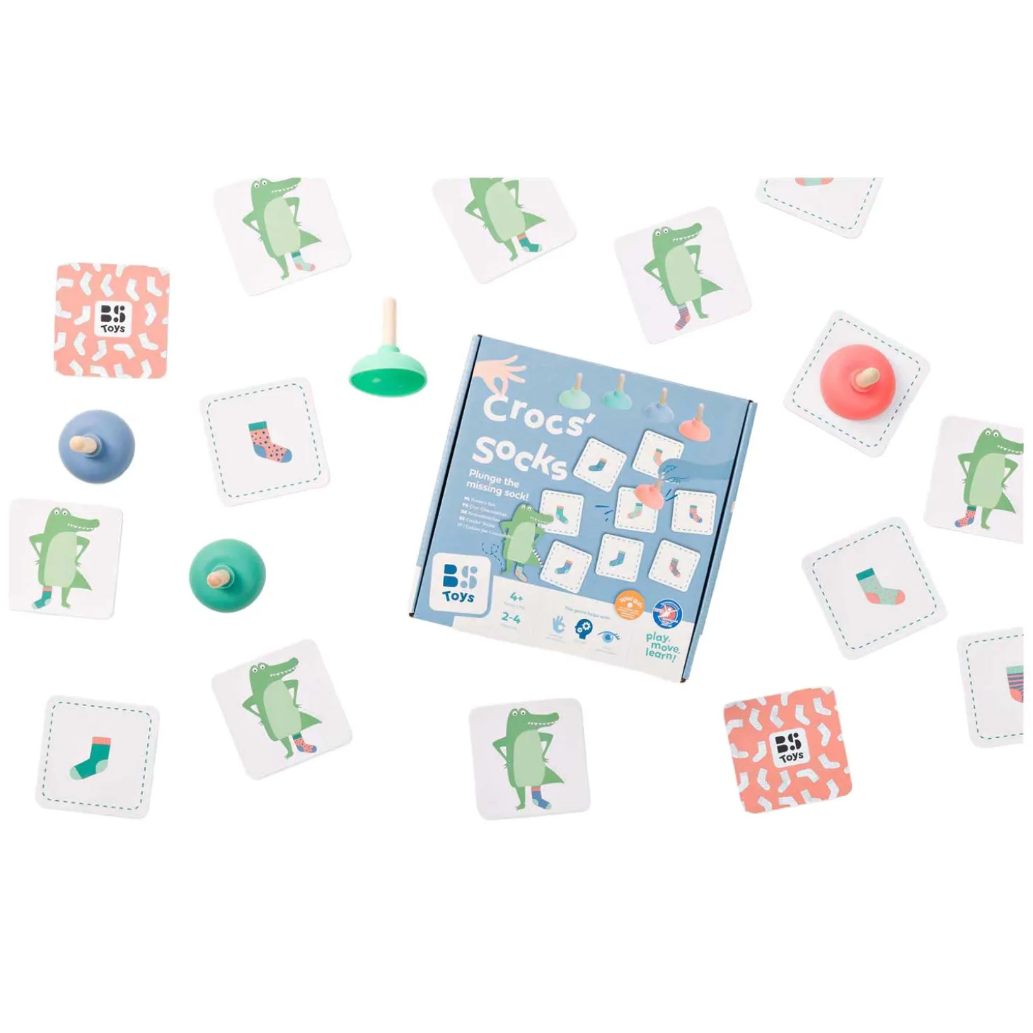 Oh oh…de krokodil is een beetje van slag. Hij is op zoek naar zijn sokken, maar hij kan geen gelijk paar vinden! Draai een kaart om en vind als eerste een sok met de plopper. Maar let op! Heeft de krokodil een linker sok of een rechter sok nodig?