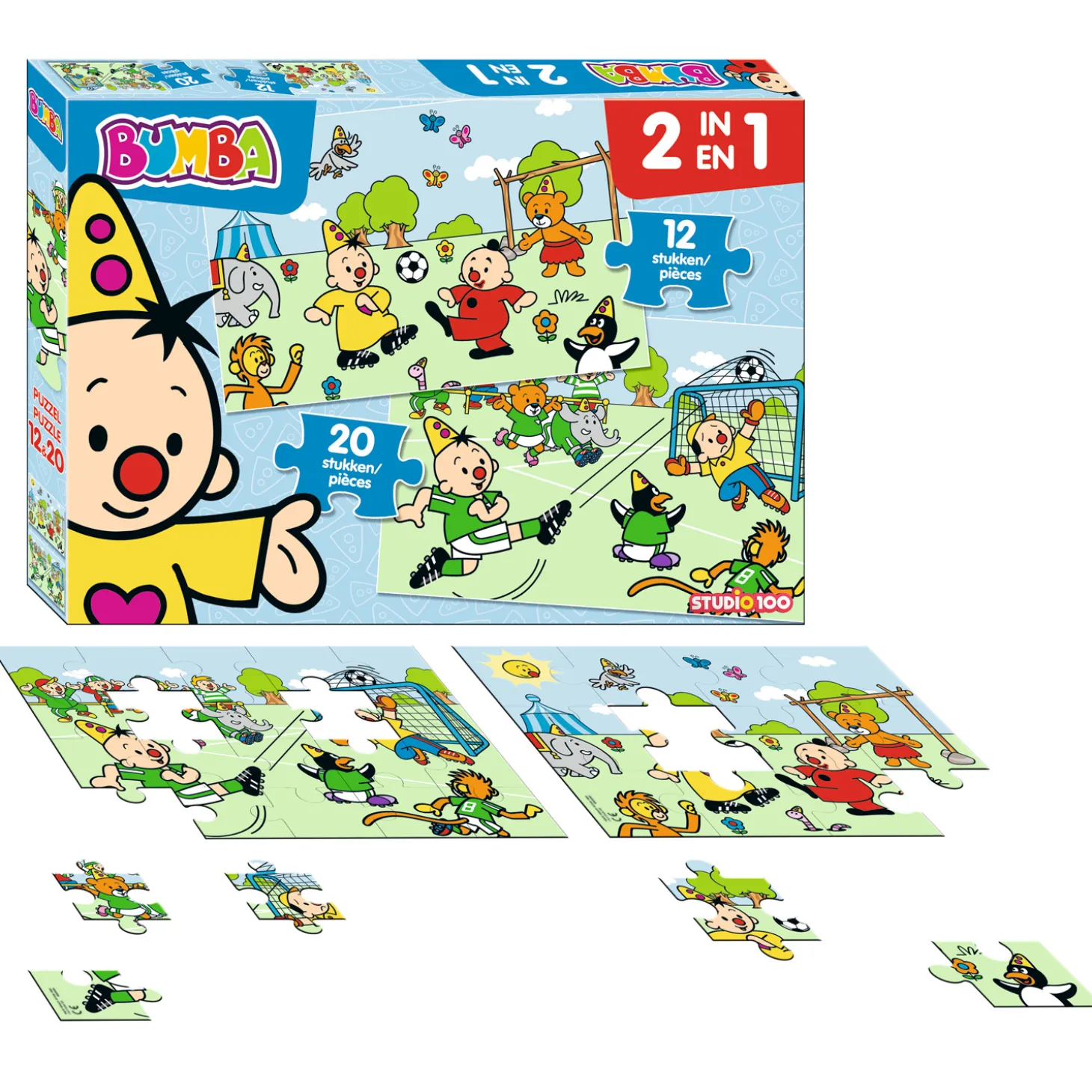 Dubbel zoveel puzzelplezier met deze 2in1 voetbalpuzzel van Bumba. In de doos zit een kartonnen puzzel van 12 en 20 stukjes. Leg de puzzelstukjes op de juiste plek en ontdek hoe Bumba samen met zijn vriendjes een potje aan het voetballen is.