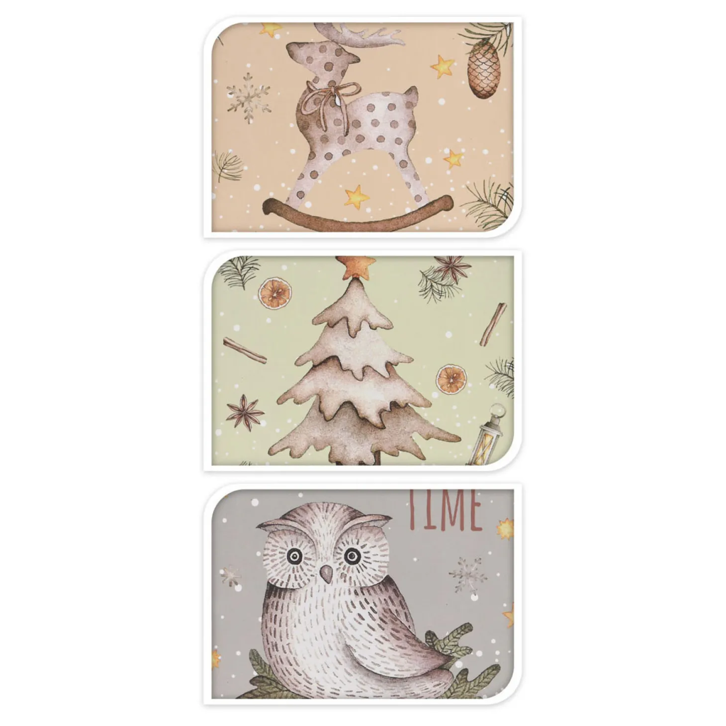 Set van 24 knusse geschenktasjes met winterthema in drie rustieke illustraties: uil, kerstboom en rendier. De geschenktasjes zijn 16 centimeter groot en hebben een sluitkoord bovenaan.