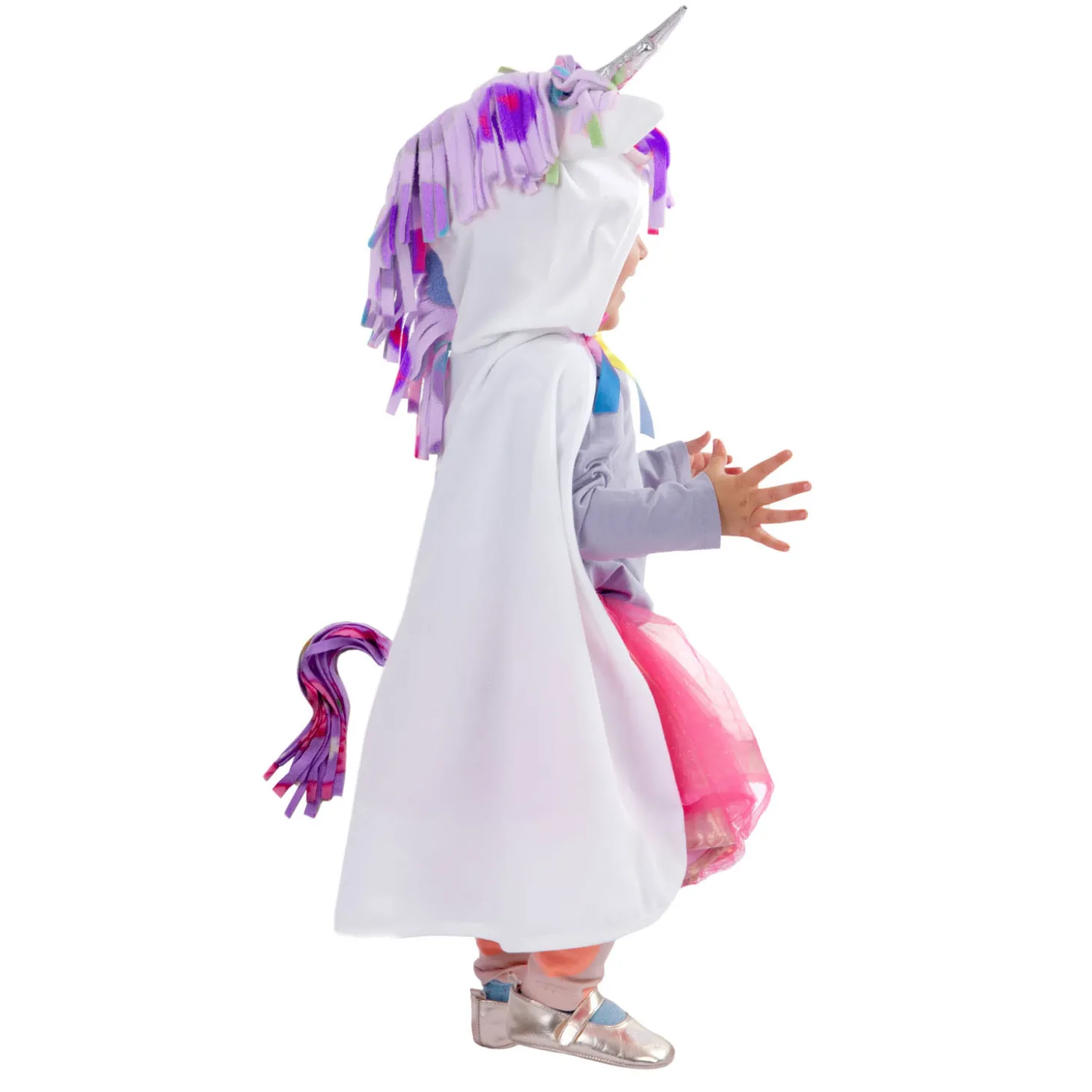 Met deze witte cape verkleed jij je als een eenhoorn! De capuchon van de cape heeft oren en een hoorn en van het puntje van de capuchon tot over de rug lopen paars gekleurde manen van de eenhoorn. Ook is er een paars met roze gekleurd staartje aan de cape bevestigd. Wat zul je lol hebben met deze cape tijdens verkleedpartijtjes! Geschikt voor kinderen van 2 tot 3 jaar.