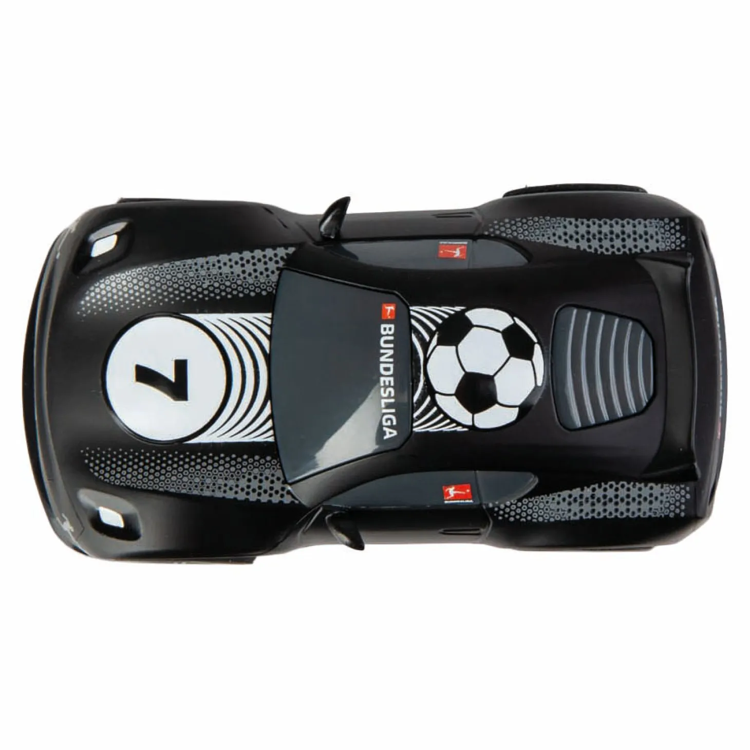 De Duitse Bundesliga zet nu ook het RC-circuit in beroering! Het 7,1 cm lange zwarte mini RC-voertuig raast met snelheden tot 5 km/u door de kinderkamer en heeft echte grip dankzij de rubberen banden. Dankzij de originele Bundesliga-licentie kunnen jonge fans vanaf 6 jaar hun auto personaliseren met stickers van 24 verschillende clubs en zo tijdens de race hun verbondenheid met hun favoriete club uiten. De voetbalrace duurt 15 minuten totdat de auto 30 minuten is bijgetankt via de meegeleverde USB-kabel. Met de nauwkeurige Full Function 2,4 GHz-besturingstechnologie overwint de auto elk obstakel.