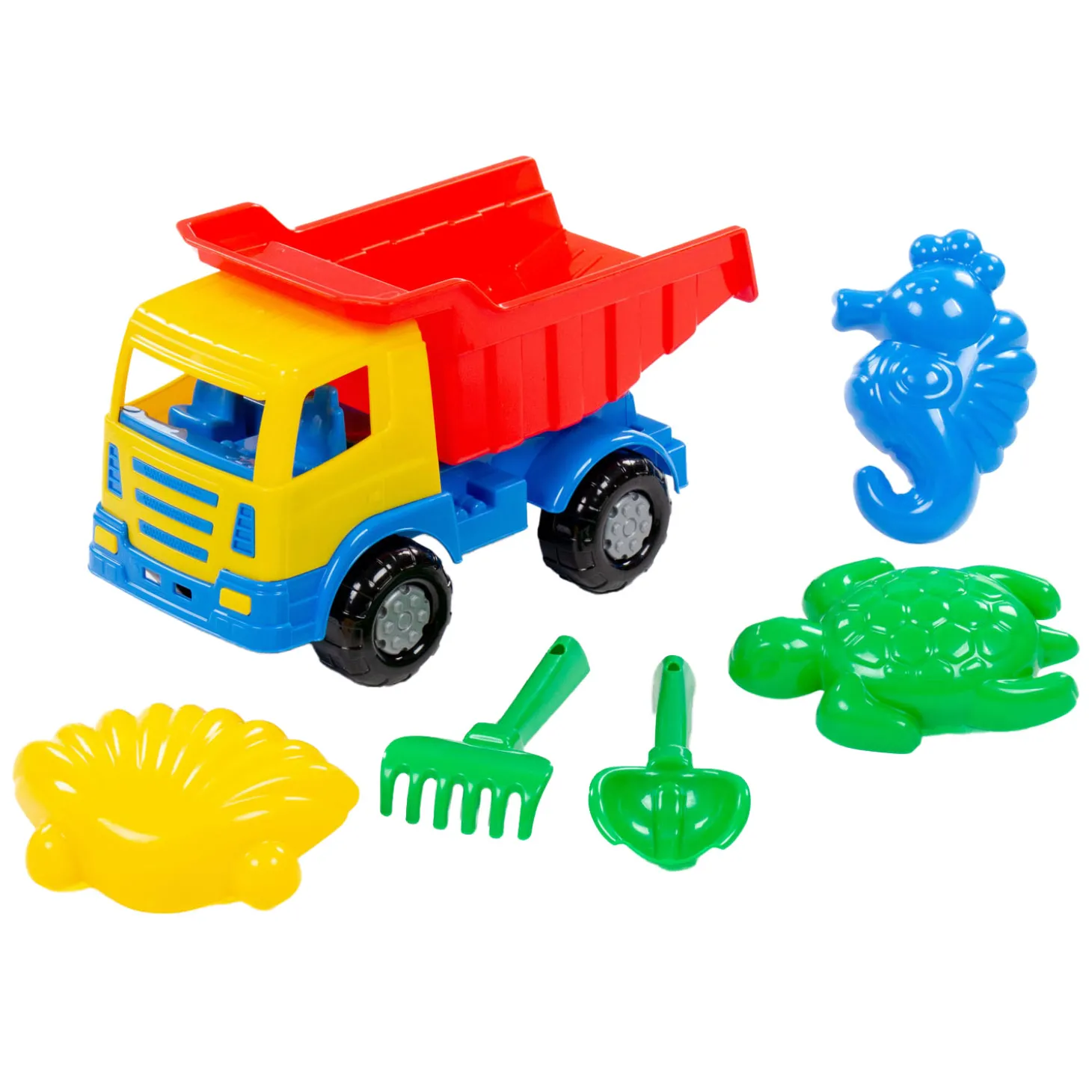 Klassieke kunststof kiepwagen met strandsetje: 3 zandvormen, een harkje en een schepje. Geschikt vanaf 12 maanden.