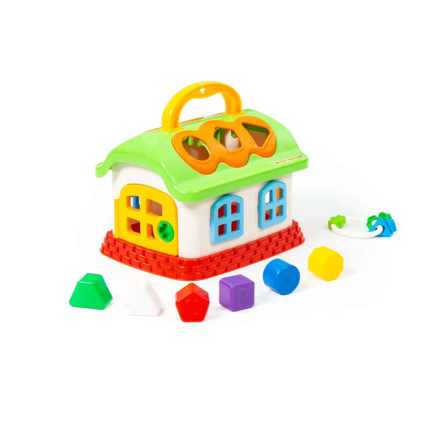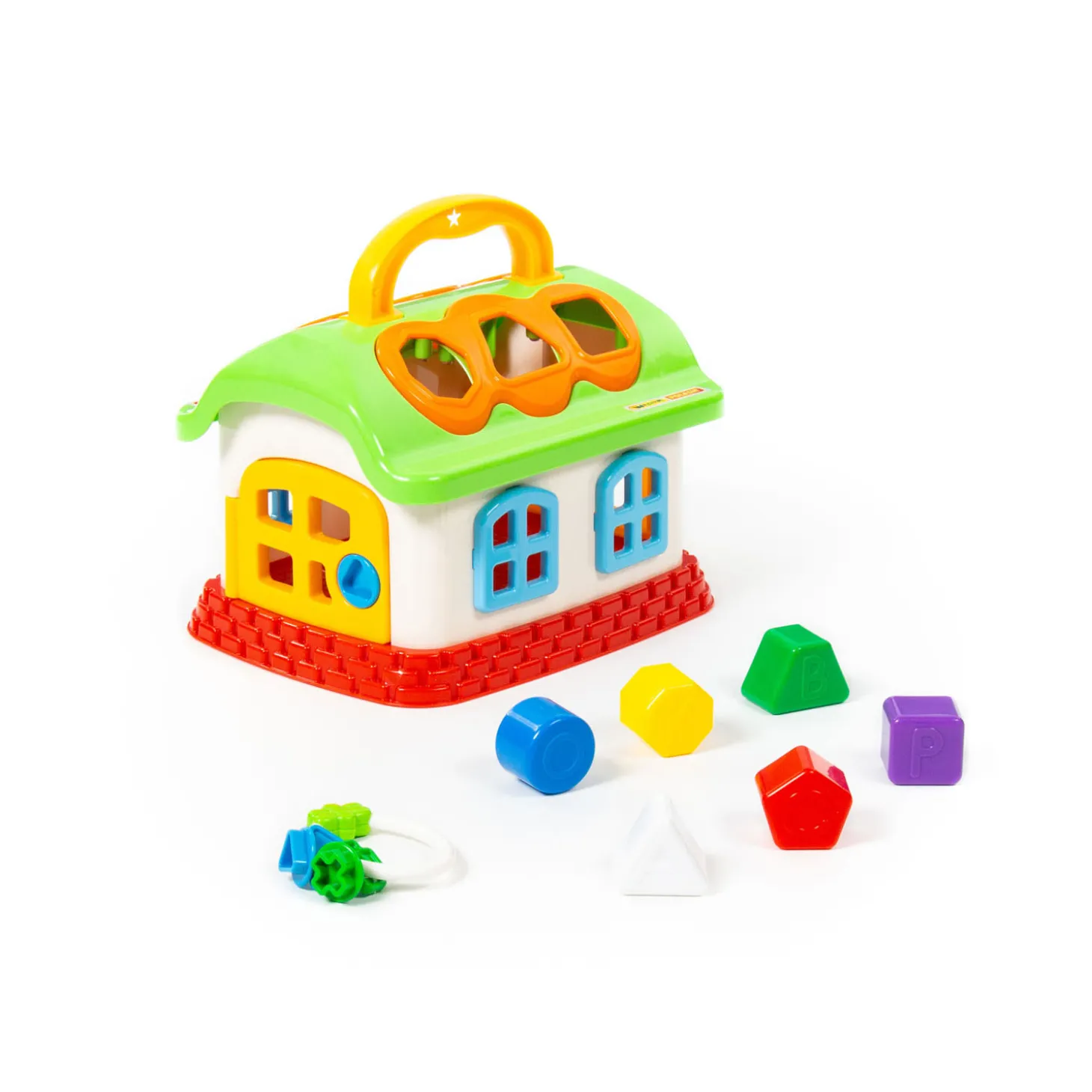 Leer vormen en kleuren herkennen met dit Cavallino Leer- en Speelhuis. Het huis heeft zes gaten voor de blokjes met verschillende vormen en vrolijke kleuren. De deur kan open en dicht met behulp van de sleutelbos. Dankzij het handvat neem je het speelhuis overal mee naartoe!