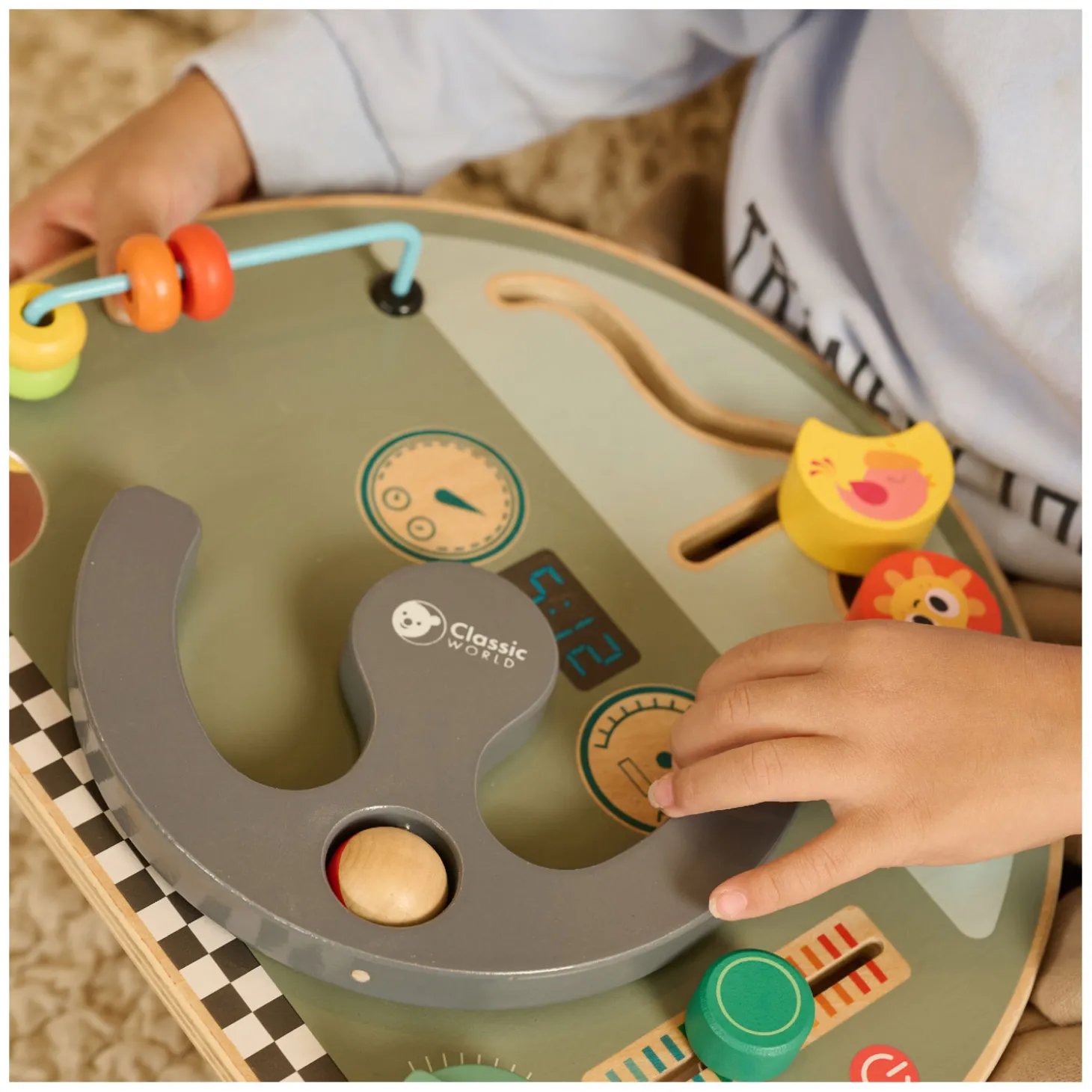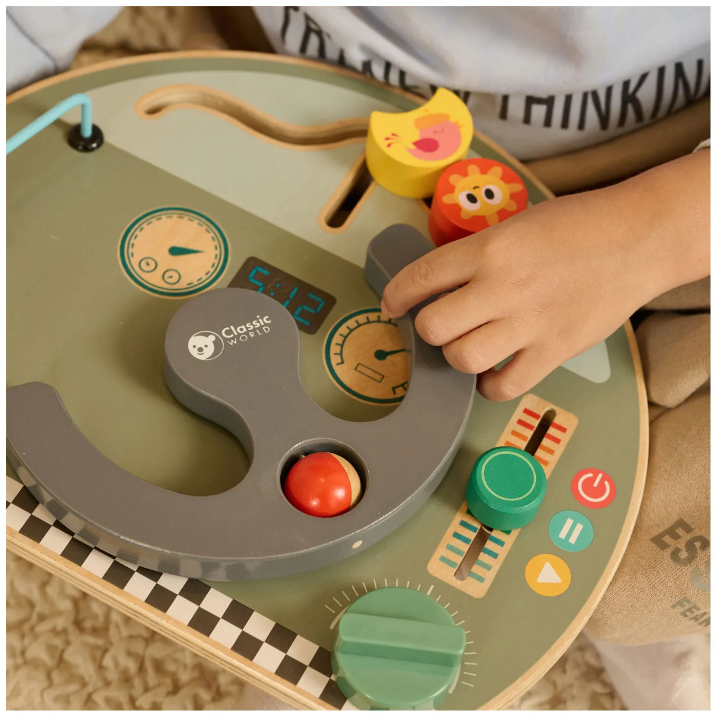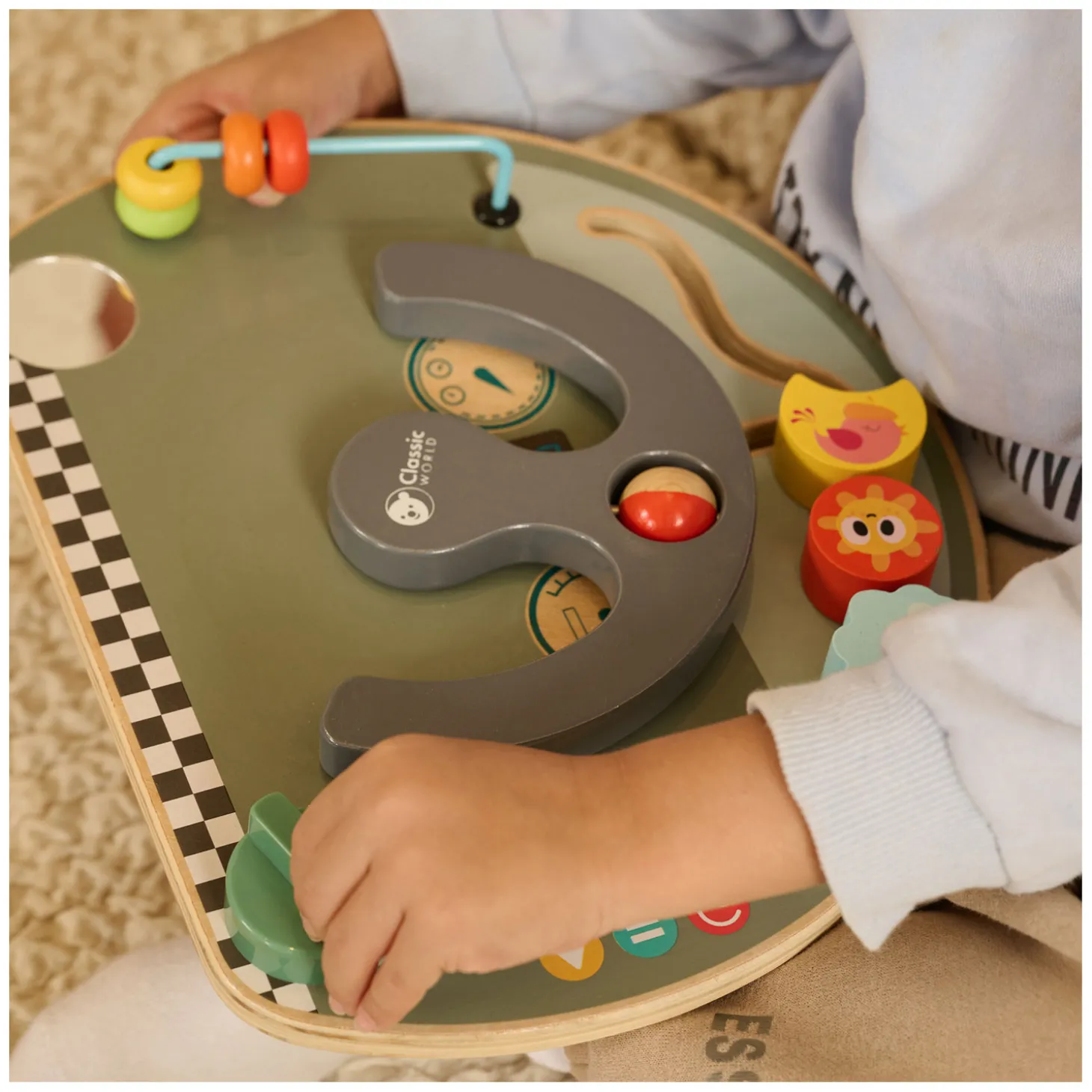 • Met o.a. schuifknoppen, draaiknop, beweegbaar stuur en kralenbaan