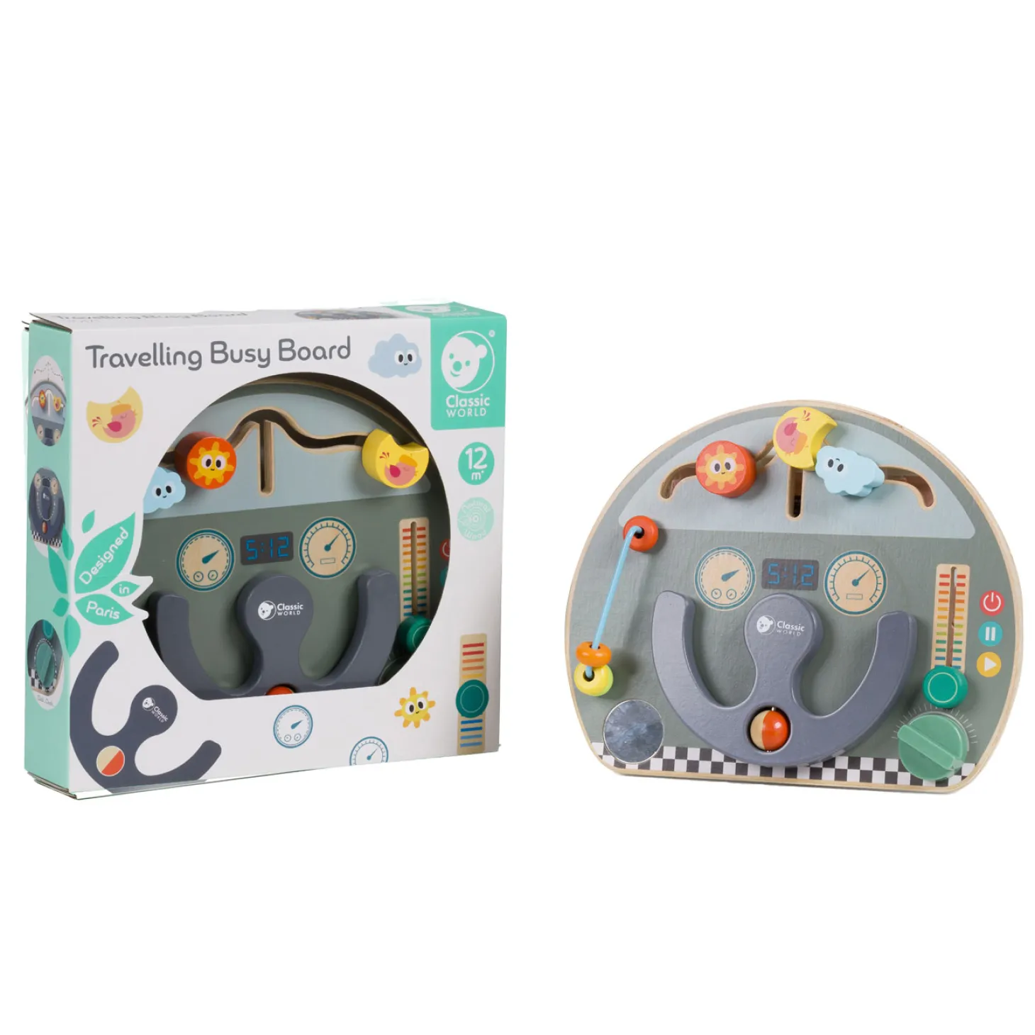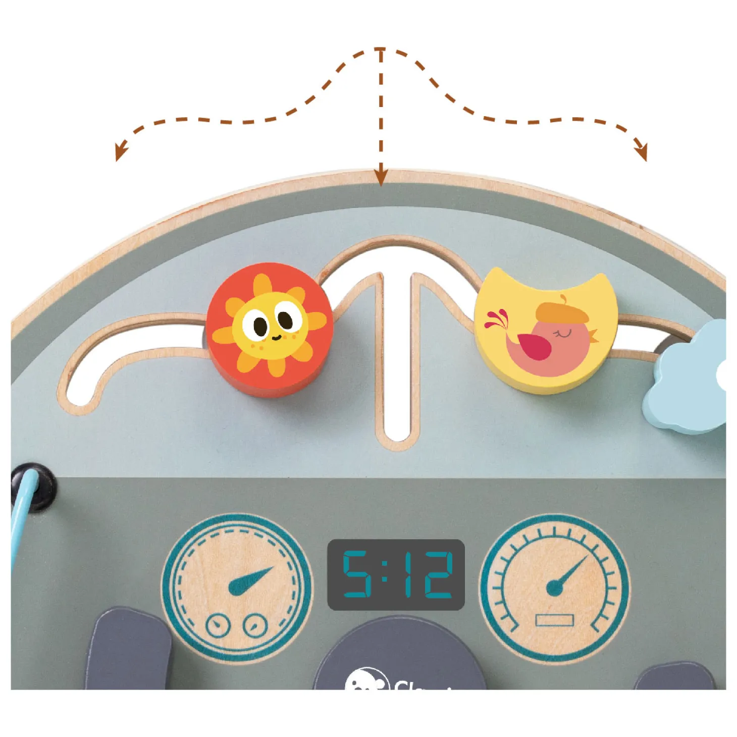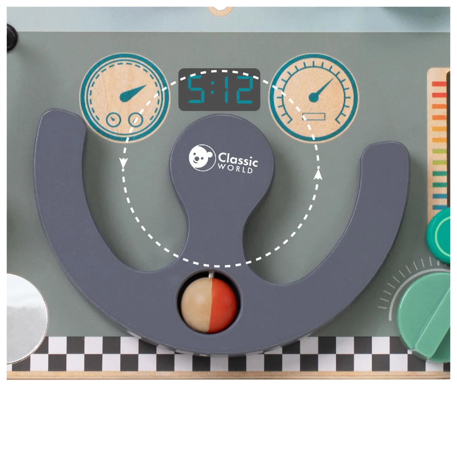 • Met o.a. schuifknoppen, draaiknop, beweegbaar stuur en kralenbaan
