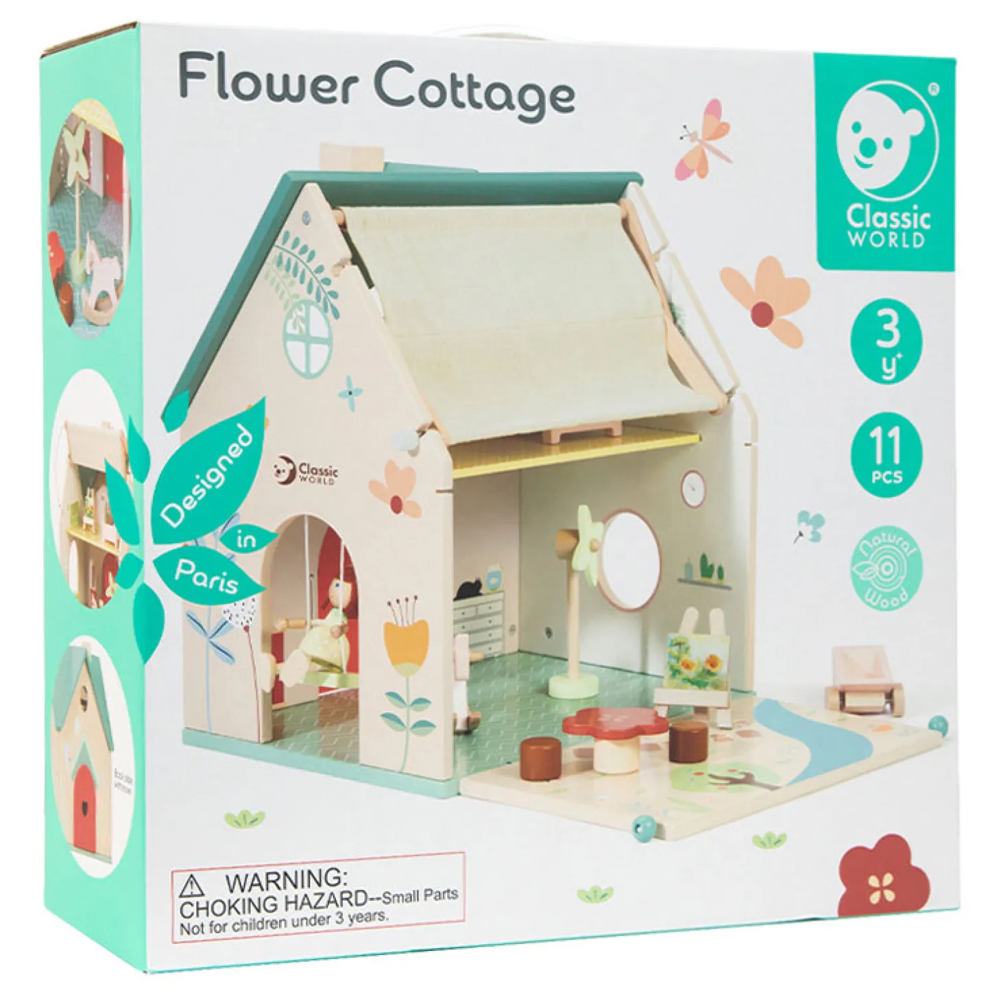 Het houten poppenhuisje is mooi versierd met geschilderde bloemen en is gemaakt van duurzaam, stevig hout. Het hout is bewerkt met kindveilige verf en lakken.