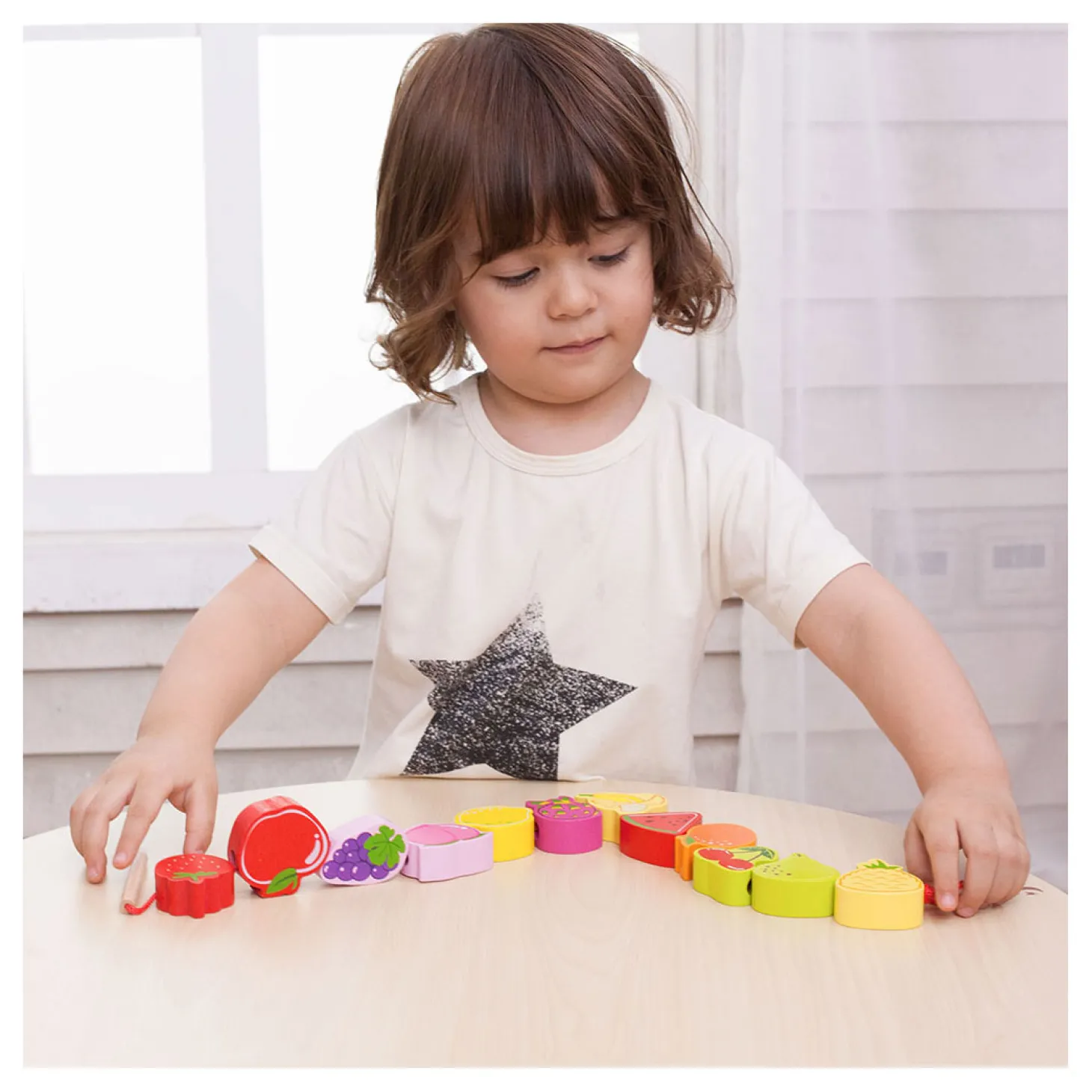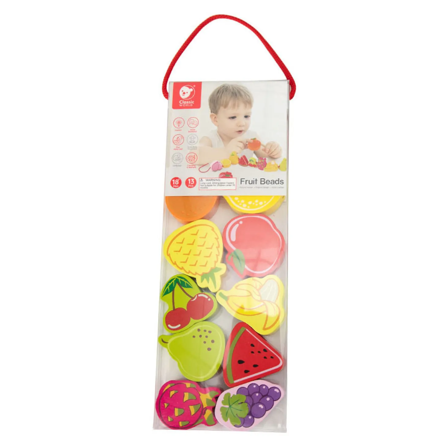 De set bestaat uit 13 houten kralen bedruk met fruit soorten, een koord met houten staafje en opbergzakje. Geschikt voor kinderen vanaf 18 maanden.