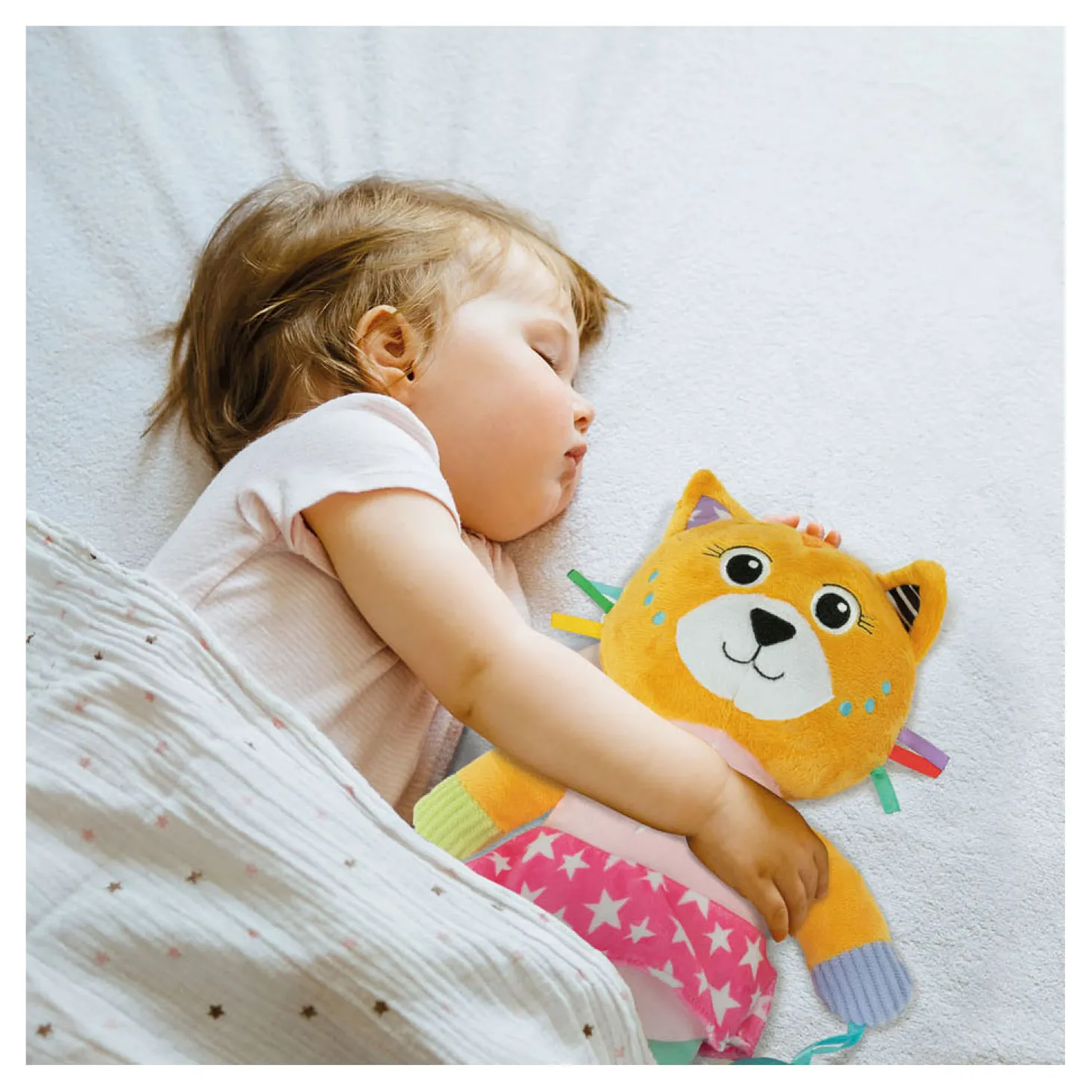 Een hele zachte knuffelkat, ontworpen voor de allerkleinsten, om ze te laten spelen in een wereld vol zachtheid! De knuffel is gemaakt van verschillende materialen voor de multisensoriĆ«le stimulering van het kind en de ontwikkeling van zijn tastzin tijdens de eerste levensfasen. Het perfecte vriendje voor de ontwikkeling van het kind. De zachte knuffel beschikt over een accessoire om op te bijten, ontworpen voor baby’s die tandjes krijgen. Machinewasbaar.